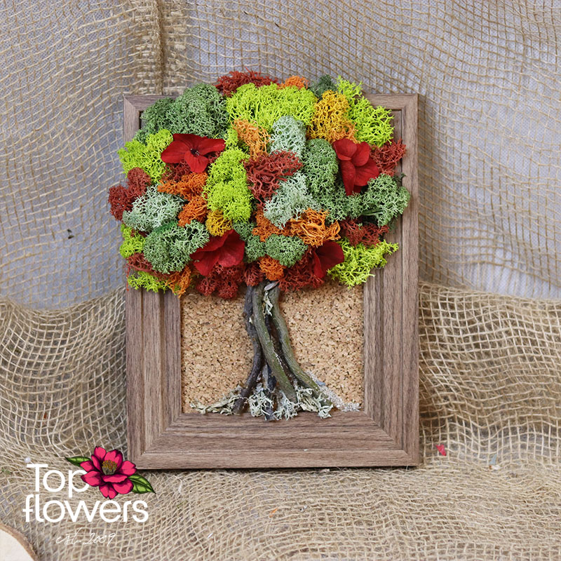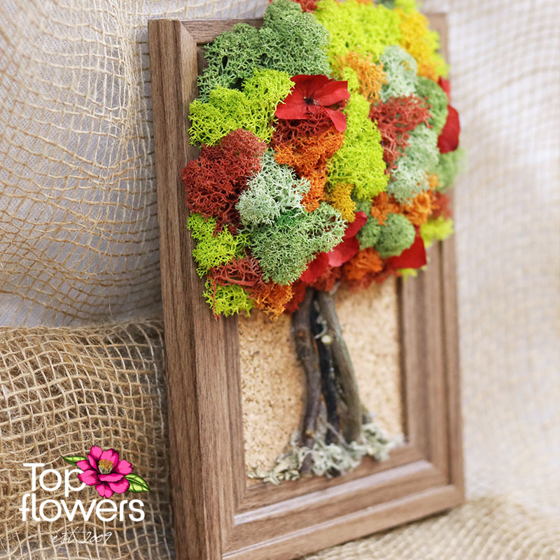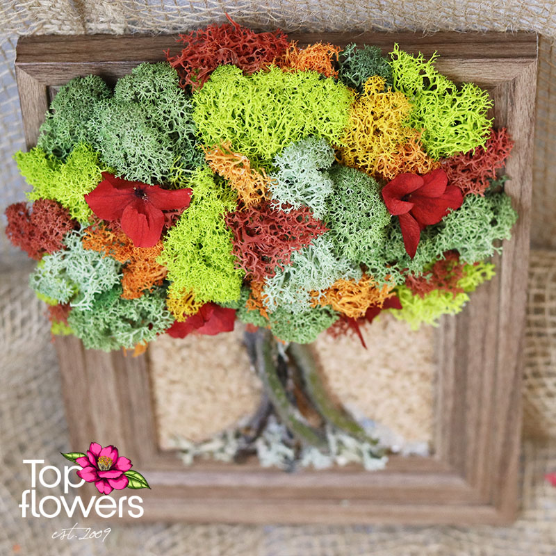 The tree shape symbolizes resilience and growth, while the vivid details add a sense of movement and life. This is not just flowers, but a modern interpretation of nature – long-lasting, stylish, and distinctive. With no need for maintenance, this living moss art preserves its fresh appearance and brings a cozy feel to any setting.