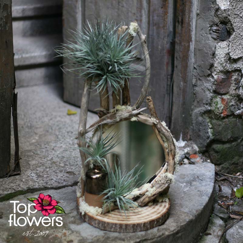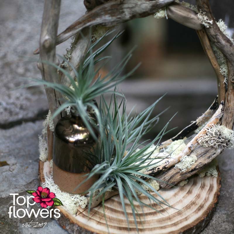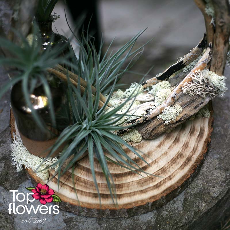“Echo of the Forest” is a captivating art installation inspired by the mysterious calm and depth of nature. It is crafted on a decorative wooden base, adorned with air plants (Tillandsia), Scandinavian moss, and natural wooden elements that evoke harmony and life.
