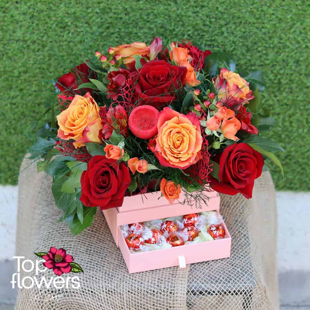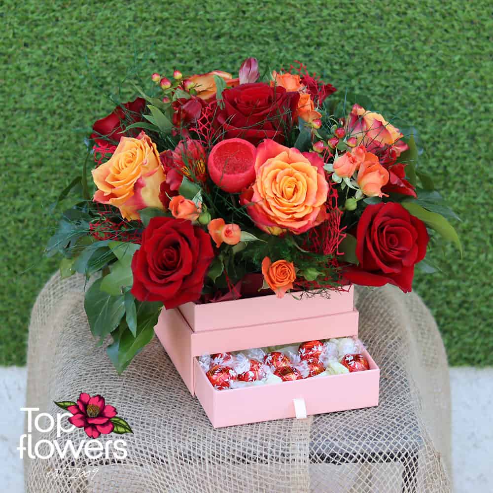 Our elegant arrangement is a beautiful blend of sensuality and a profusion of colors. Red and fiery roses, captivating the gaze, intertwine with orange mini roses, adding a touch of energy and warmth. The red alstroemeria and hypericum contribute with elegance and balance, while fresh greens complete the overall look with their natural beauty.