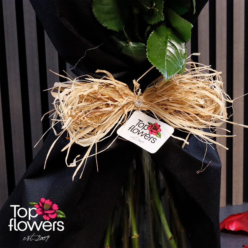 Each rose in this bouquet is carefully selected to create a sense of balance, elegance, and completeness. The stylish black wrapping enhances the depth of the colors, while the ribbon made of natural materials adds warmth and a natural finishing touch.