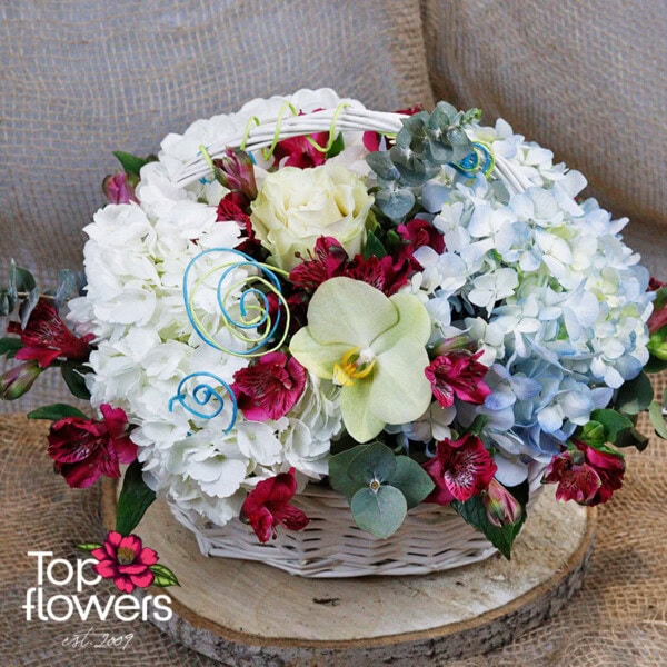"Call for Summer" is a light and refreshing floral arrangement inspired by carefree sunny days and the gentle breeze of the season. Set in a white woven decorative basket, this composition radiates softness and charm, with lush hydrangeas at its heart. Accented with orchid, alstroemeria, and rose, the design offers a harmonious blend of elegance and warmth. Enhanced with seasonal greenery, this arrangement brings a touch of sunshine and joy to any space. Perfect as a thoughtful gift or a radiant addition to your home or office décor.