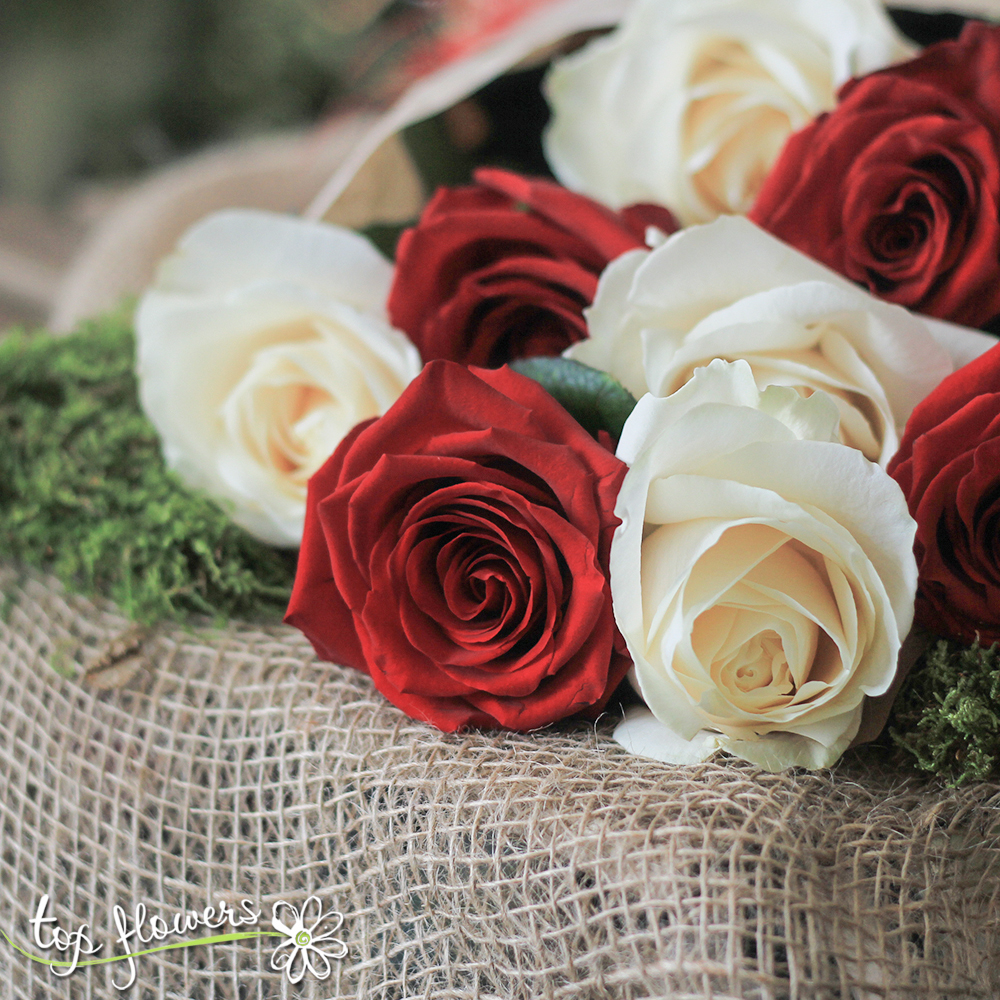 Great combination of classic boquet of red and white roses gently arranged in natural paper.