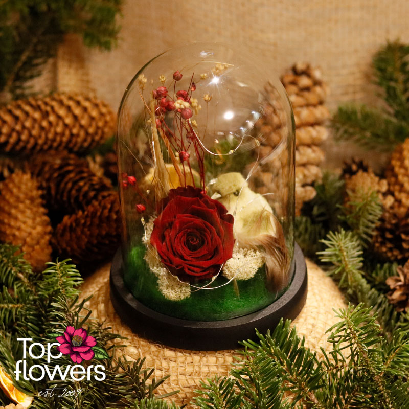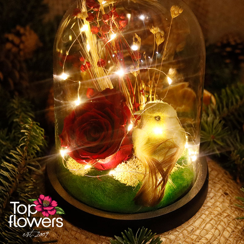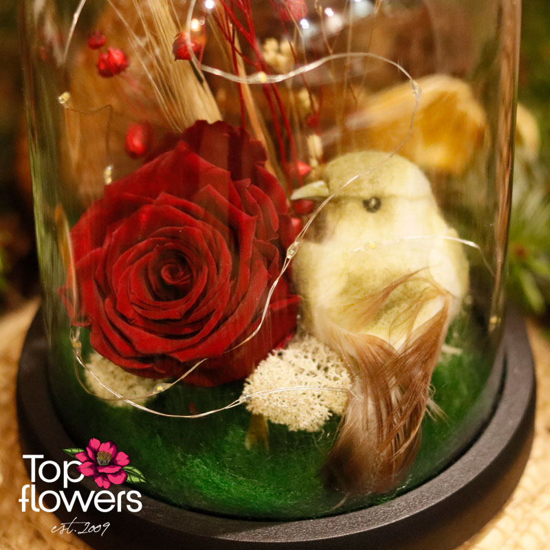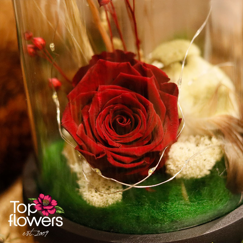 Placed under a transparent decorative dome with LED lighting, it radiates warmth and romance even in the darkest night. The gentle light highlights every petal, turning the rose into an elegant accent for any home, office, or special gift. The decorative chick and natural materials add a touch of charm and authenticity to the composition.