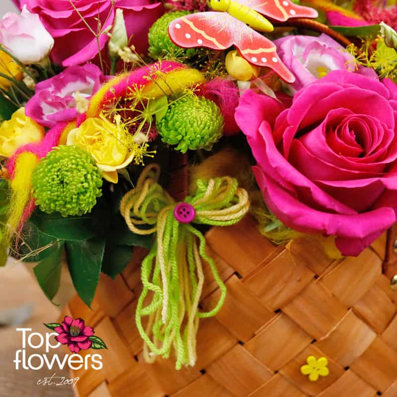 The arrangement is artfully placed in a decorative woven bag, which gives additional charm and grace to the whole composition. This "Garden" is the perfect way to express your love and appreciation for someone, associate seasonal flowers with joy and beauty, or simply create an atmosphere of color harmony in your home.