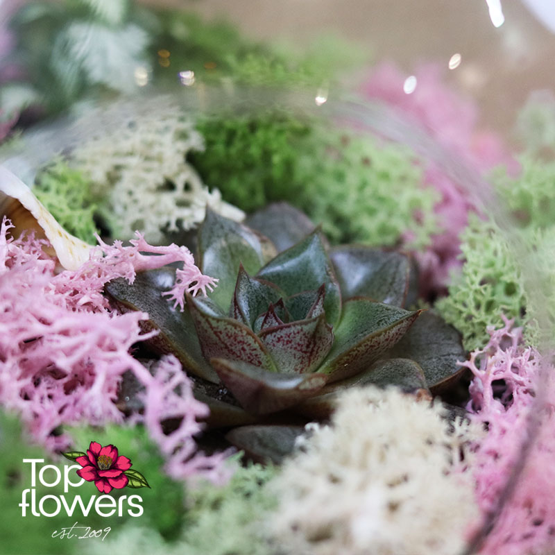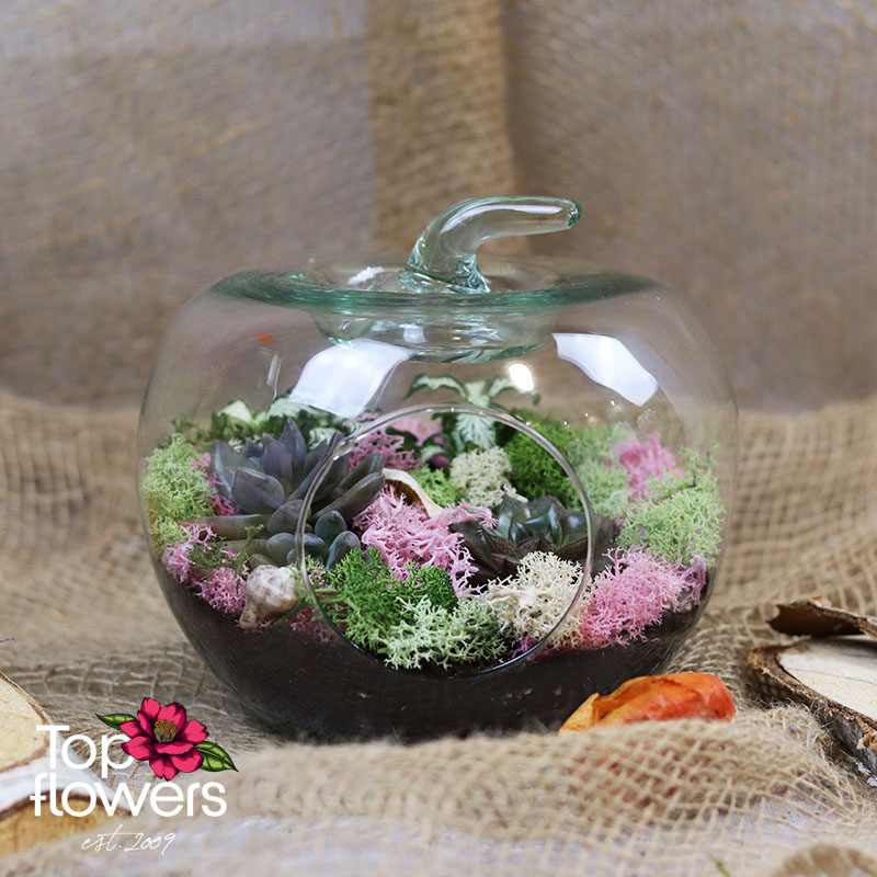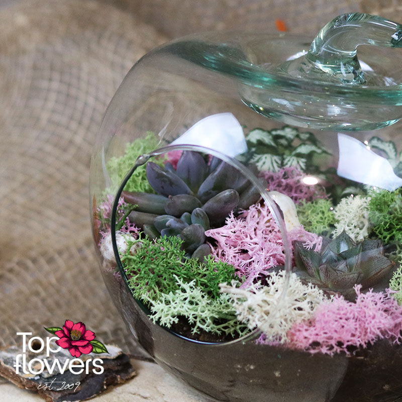 Sometimes the most beautiful flowers do not need a grand gesture, but an interesting shape in which to come to life. Mix of Flowers 4 is a delicate and modern arrangement created in a glass container shaped like an apple, turning the design into a small world with character. Inside, we have combined succulents, Scandinavian moss in green, white and pink, and a carefully selected mix of foliage or flowering plants to achieve a fresh, balanced and long-lasting look.