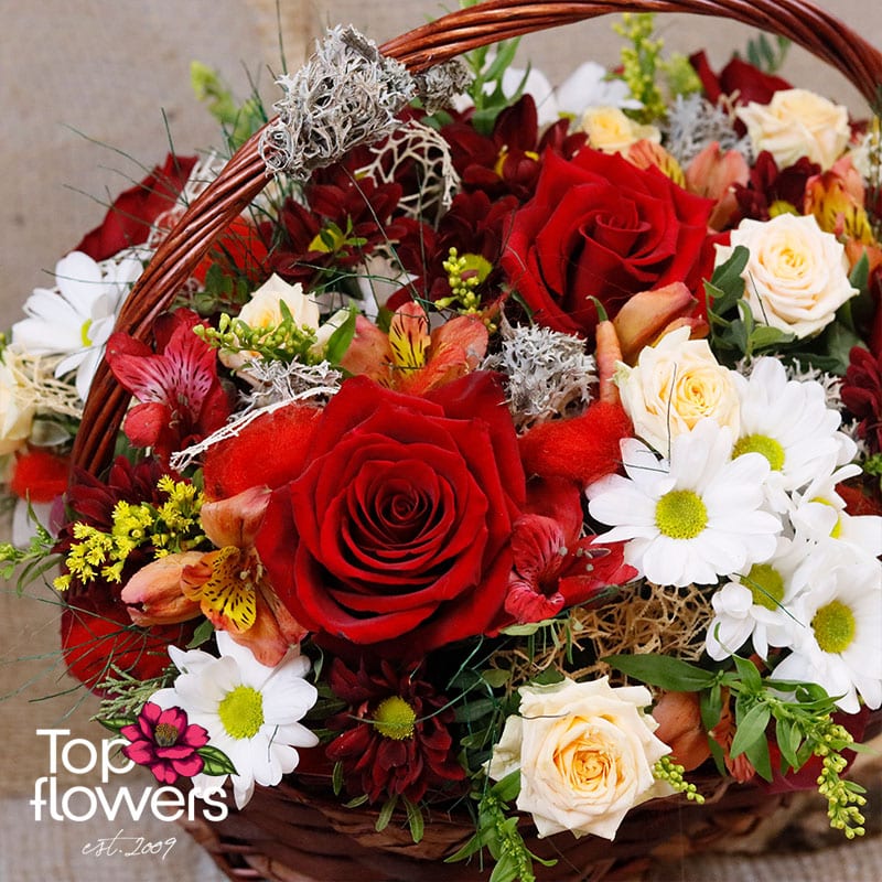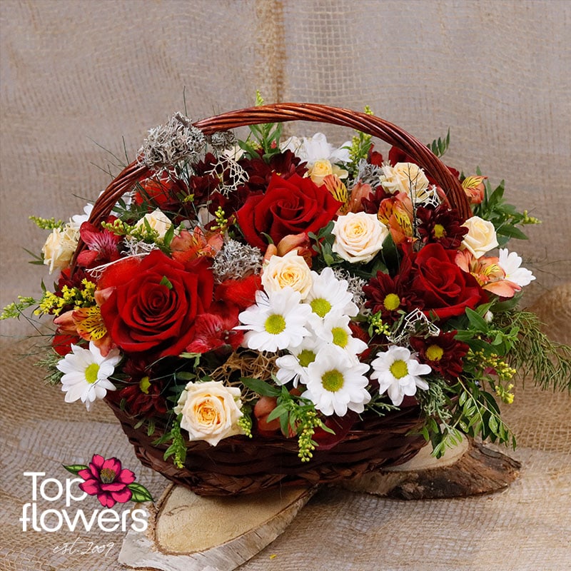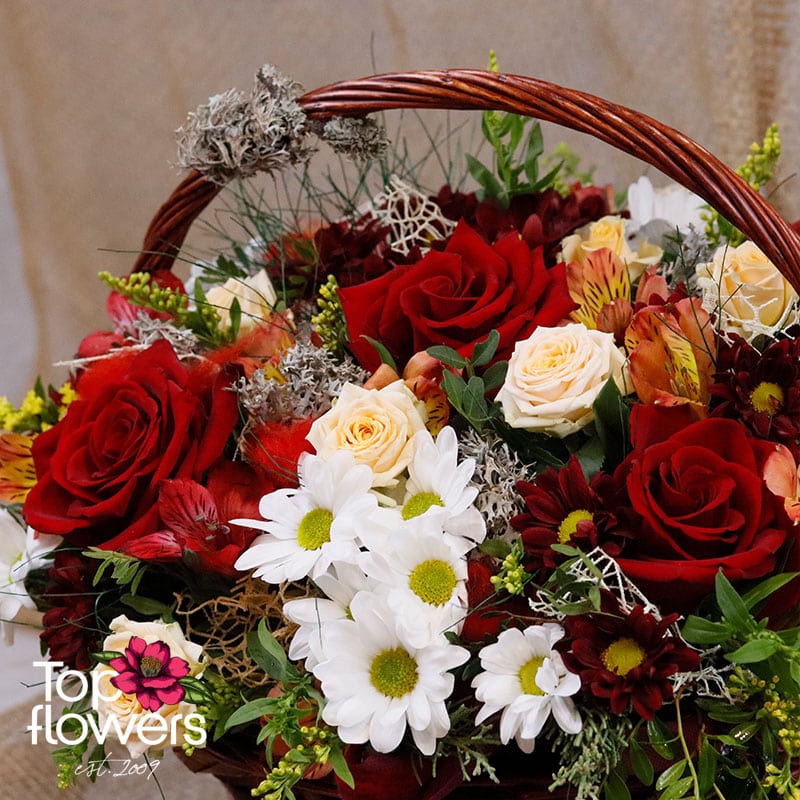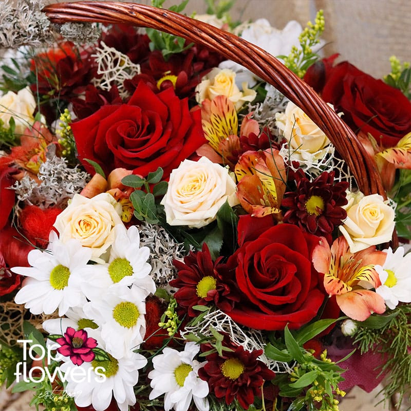 I Can’t Without You is a flower basket created to express a strong emotion – affection, love, and sincerity, without unnecessary words. It is an arrangement with a rich, warm character, where the classic red rose takes center stage as a symbol of deep feeling, complemented by the tenderness of mini roses, the freshness of chrysanthemums, and the gentle dynamism of alstroemeria. The blend of colors and textures creates a sense of completeness and balance – emotional yet elegant.