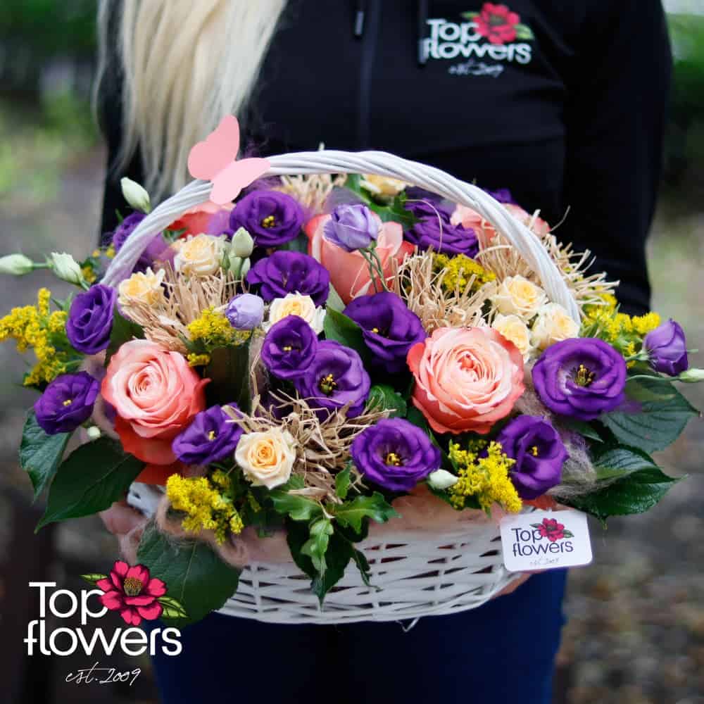 The "Luck" basket represents a beautiful combination of flowers. It includes 5 roses, 3 mini roses, and 5 lisianthus. Additionally, seasonal greens are included to complement the beauty of the flowers. The basket is of medium size and made of decorative woven material. To ensure maximum freshness and longevity of the flowers, we use Piaflora Oasis Max. The decoration of the basket may vary depending on availability. The "Luck" basket is a perfect choice for a gift or special occasion, carrying a message of luck and joy.