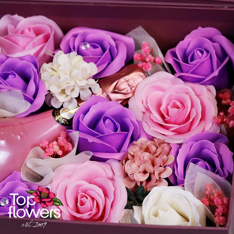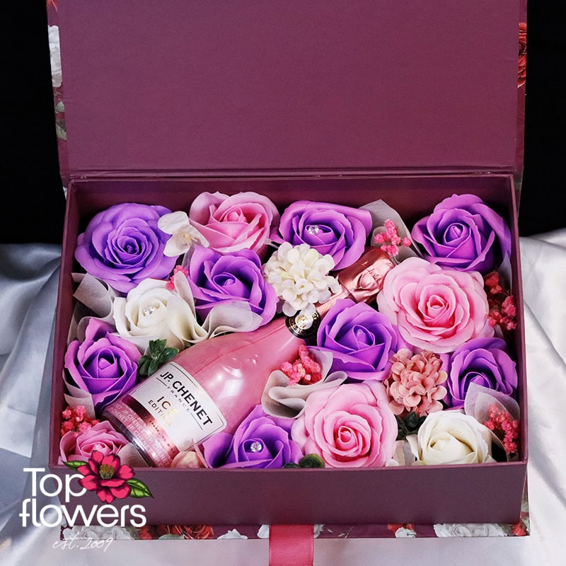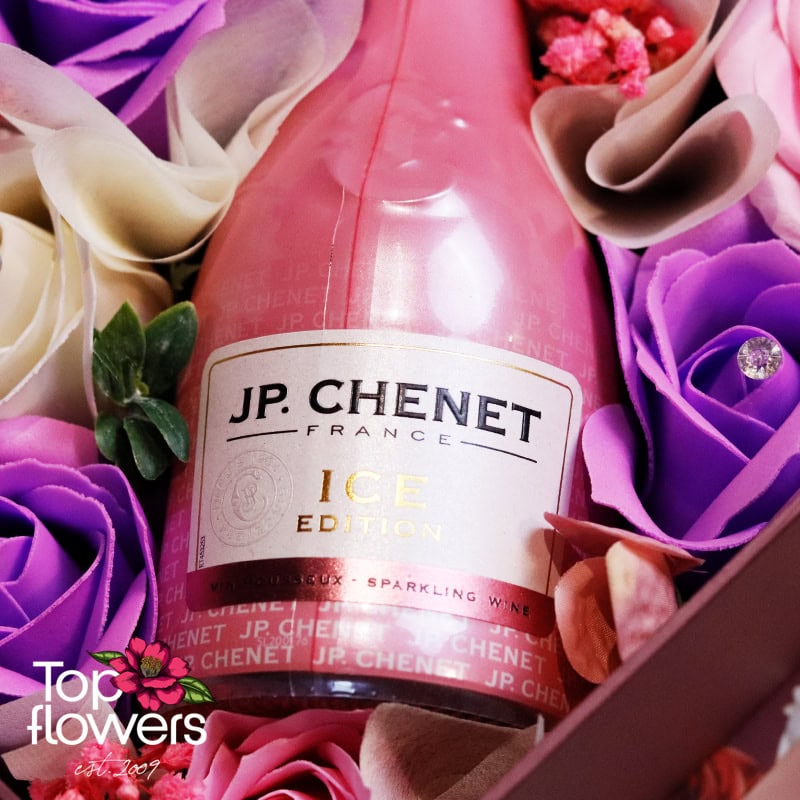 The soap roses are of premium quality with an exceptionally realistic appearance. They retain their shape and rich colors over time without the need for maintenance – a symbol of a feeling that does not fade. At the center of the arrangement is JP Chenet ICE Edition – fresh, light, and modern sparkling wine, perfect for festive moments and spontaneous occasions of joy.
