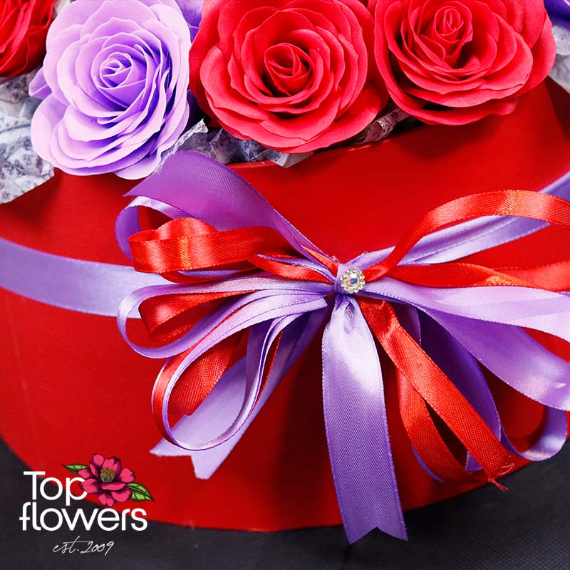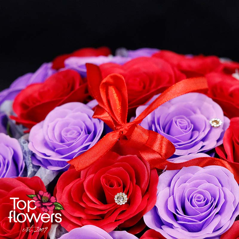 Obsession is a composition that does not seek attention – it commands it. The contrast between deep red and soft purple soap roses creates a powerful visual impact and conveys a sense of passion, intense emotion, and a bold, decisive gesture. This is a gift for moments when you want to show that the feeling is strong, clear, and unforgettable. The flowers speak confidently – of desire, attraction, and emotion that cannot go unnoticed.