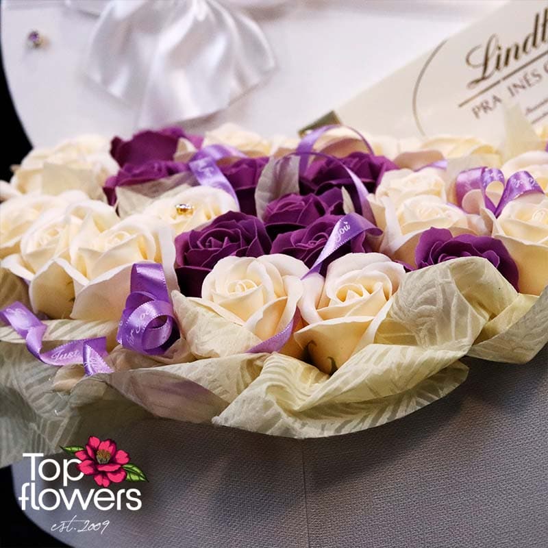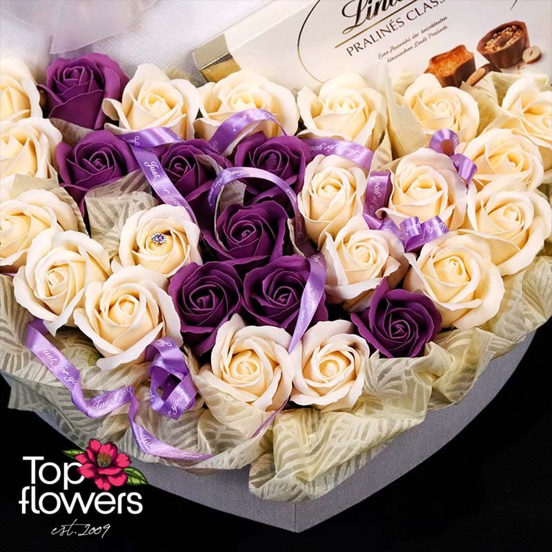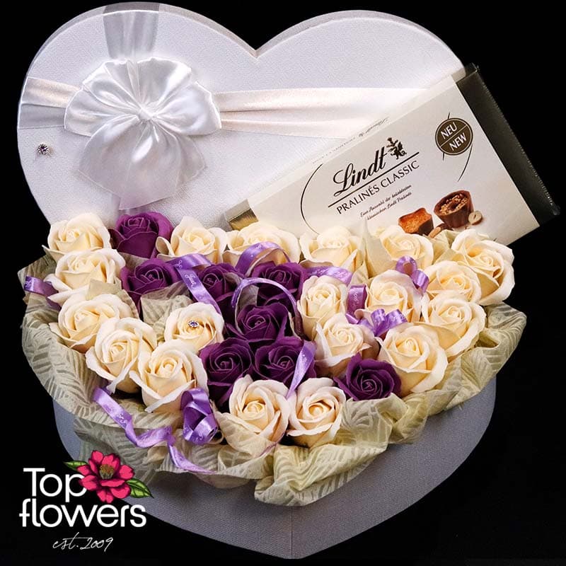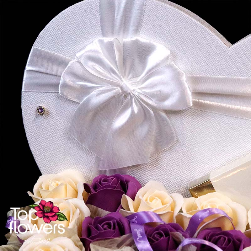 Royal Tenderness | Soap Roses in a Box with Chocolates is a gift that impresses with elegance and sophistication. In an exquisite heart-shaped box are arranged 27 premium-quality soap roses – a combination of cream-white and purple shades that convey class and unique style. These roses look just like real ones but remain beautiful and fresh indefinitely, becoming a symbol of lasting love and care.