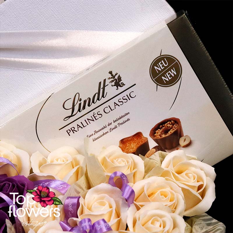 The composition is complemented by a Lindt chocolate box (125 g), adding completeness and sweet temptation to the gift. A satin ribbon and fine decorative accents further enhance its luxurious and polished look.