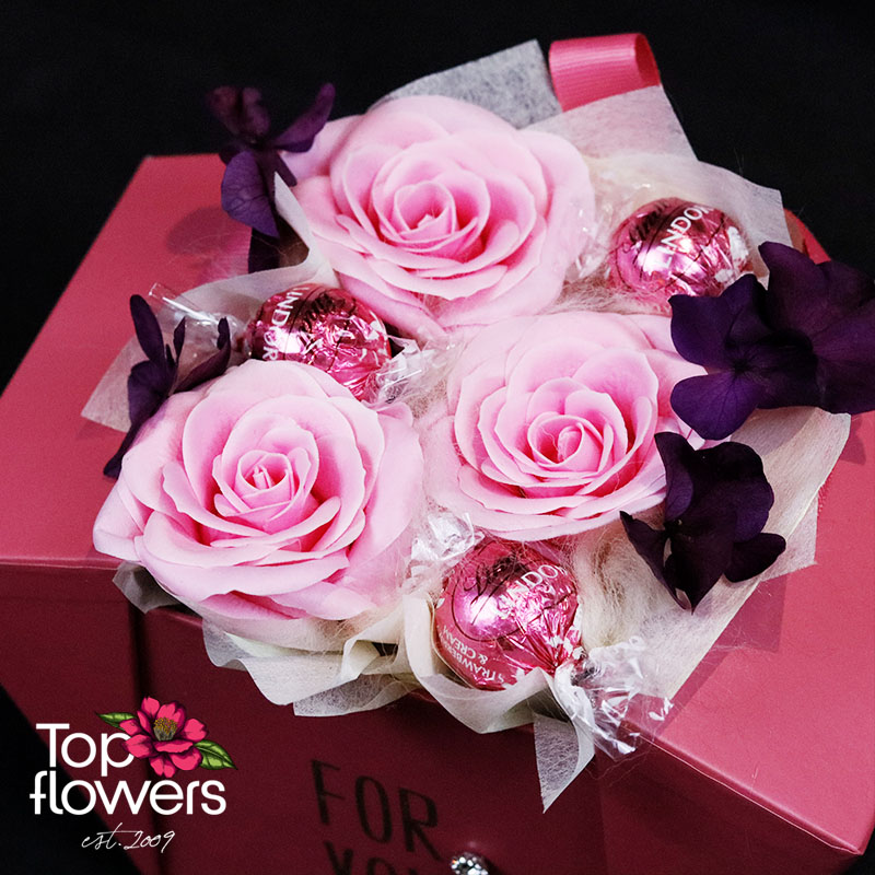 The soap roses are of premium quality and retain their shape and color for a long time without maintenance. They are the perfect choice when you want a gift to remain as a keepsake, not fade after a day or two. Lindor chocolates add a gentle sweet accent that enhances the sense of temptation, while the dehydrated hydrangea brings natural texture and a subtle contrast to the arrangement.