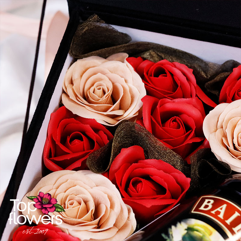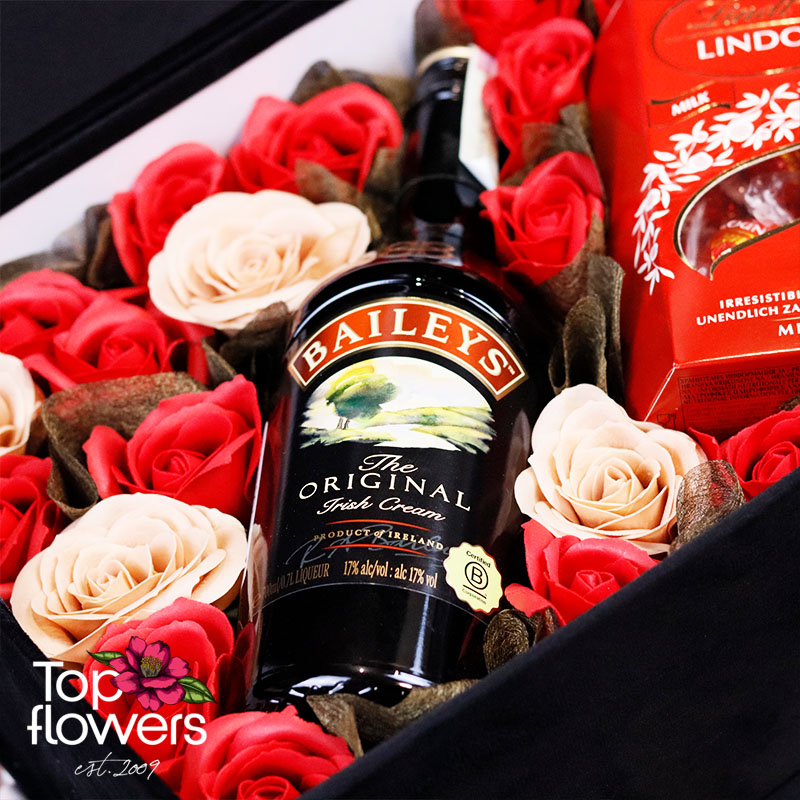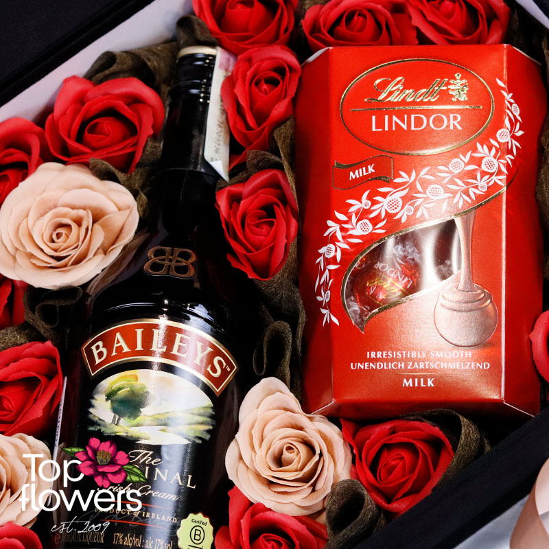 This composition of soap roses with Baileys and Lindor is created with a sense of warmth, richness, and deep emotion – the kind of attention that is remembered for a long time.