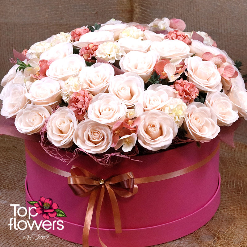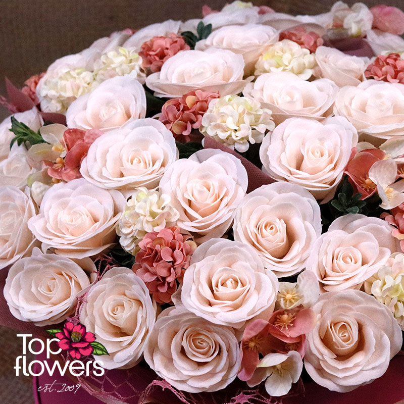The soap roses are made from high-quality materials and preserve their shape and appearance over time. They require no maintenance, do not wilt, and do not change color, turning this box into a long-lasting memory. The composition is complemented with decorative filler and carefully selected elements that enhance the feeling of volume and luxury, without distracting from what matters most – the roses.