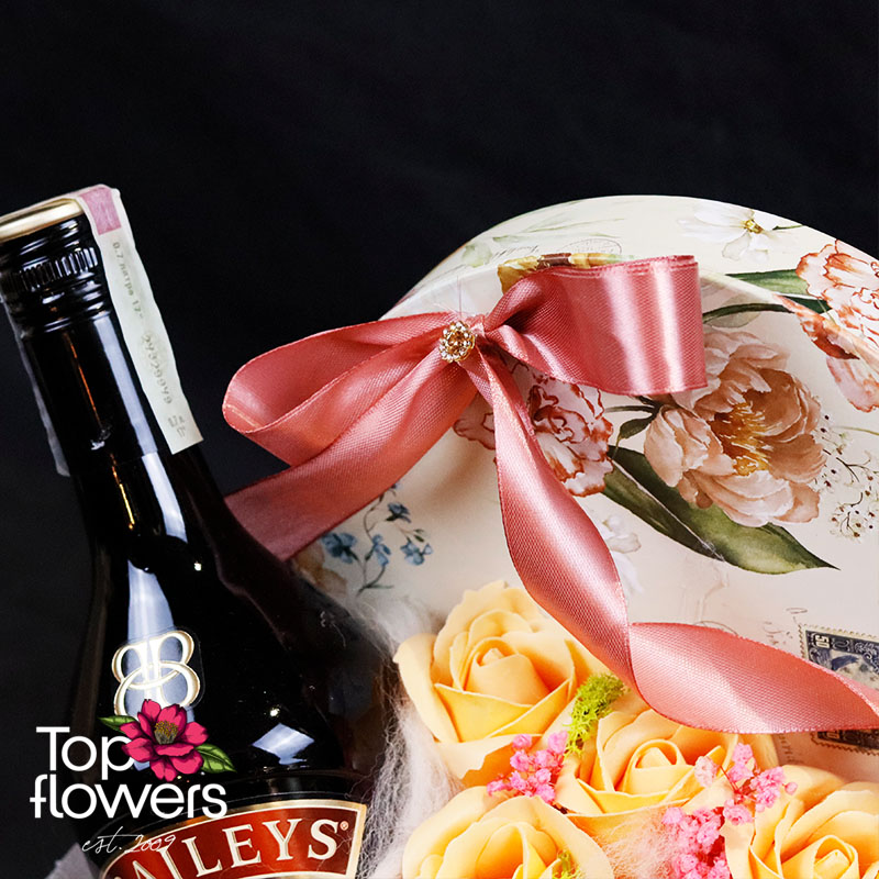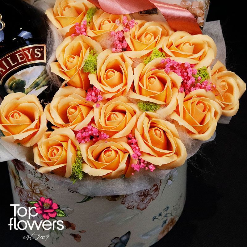 The soap roses are of premium quality and keep their shape and color for a long time without any maintenance. They offer beauty that lasts well beyond the occasion. Baileys Original adds a rich, velvety accent and transforms the composition into a true indulgence for the senses – balanced, gentle, and memorable.