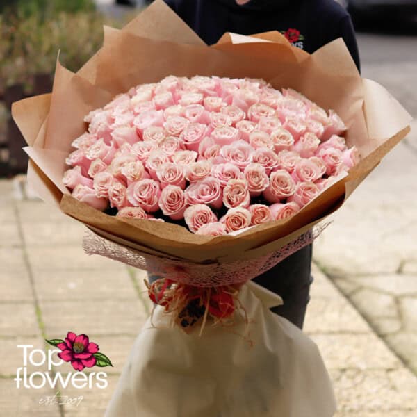 Розите са символ на любов, нежност и приятелство, а като брой 101 те изпращат мощно послание за възхита и обич. Розите са в нюанс на розово, което допълнително подчертава техния романтичен и нежен характер. Този букет е подходящ за особени моменти като годежи, рождени дни, юбилеи или просто като жест на изключителна обич и внимание към специален човек във вашият живот.