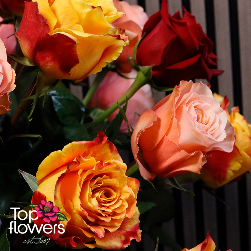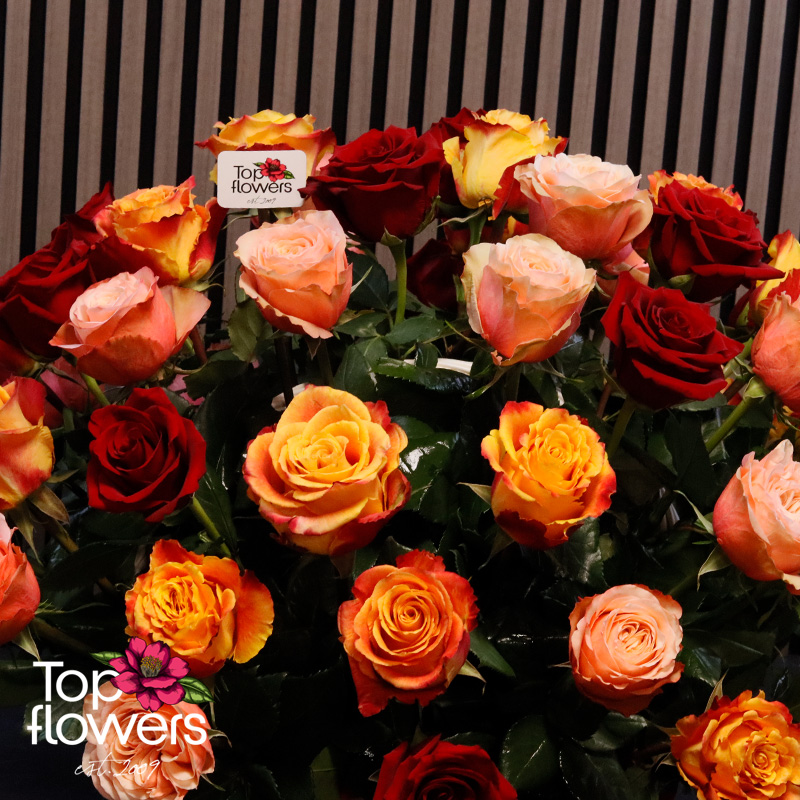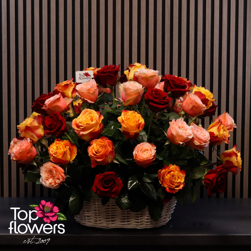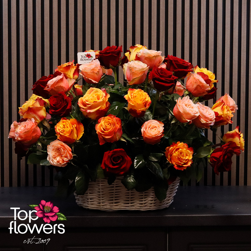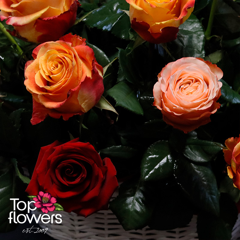 Понякога думите не стигат… и тогава идват цветята. Тази впечатляваща кошница с рози в топла гама е създадена, за да предава емоции – от страст и възхищение до нежност и благодарност. Съчетава рози в огнени нюанси на червено, оранжево и прасковено, които създават усещане за уют, енергия и лукс още от първия поглед.
