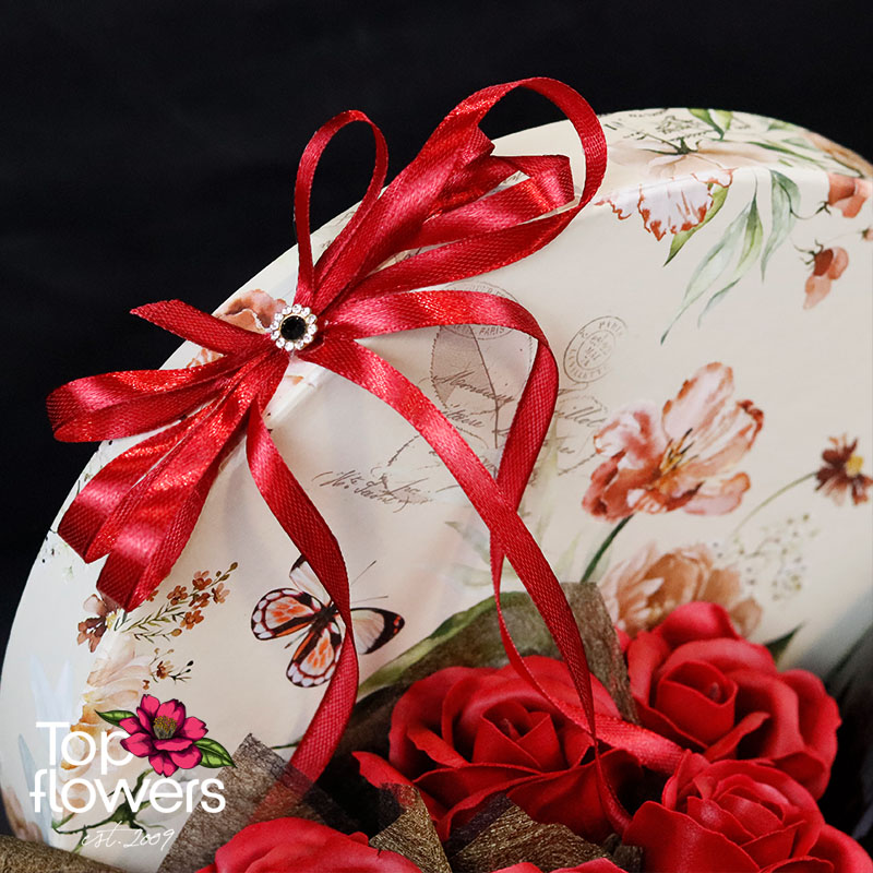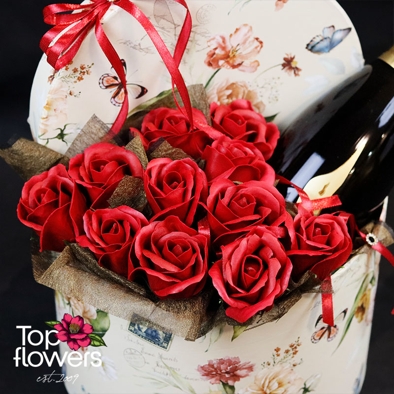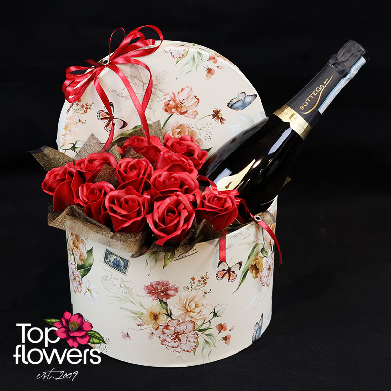 Алено е подарък, който говори без думи – за страст, внимание и специален жест. Това е елегантна композиция от сапунени рози в наситено червено, съчетани с фино просеко Bottega Il Vino dei Poeti, поднесени в стилна луксозна картонена кутия. Цветята тук не са просто акцент – те са послание. Червените рози символизират любов, уважение и силна емоция, а сапунените рози добавят усещане за дълготрайност и спомен, който остава.