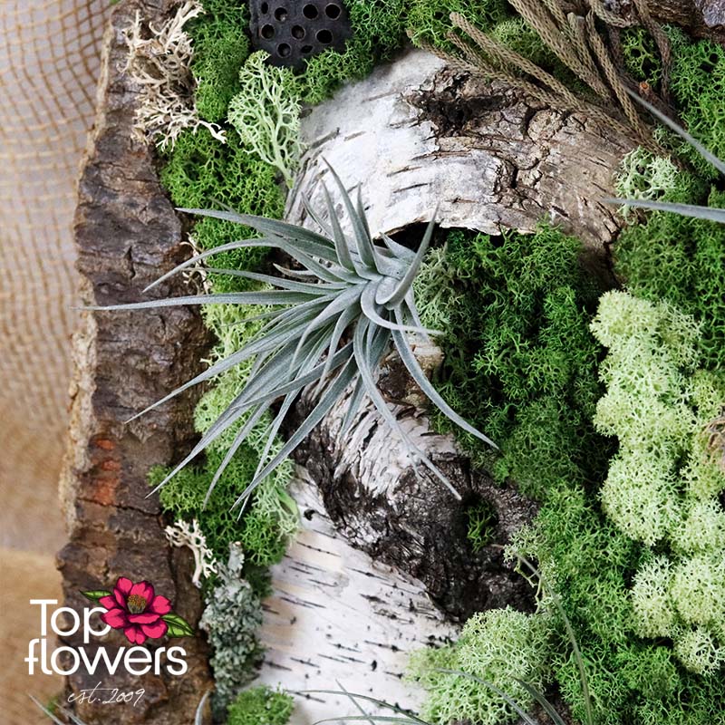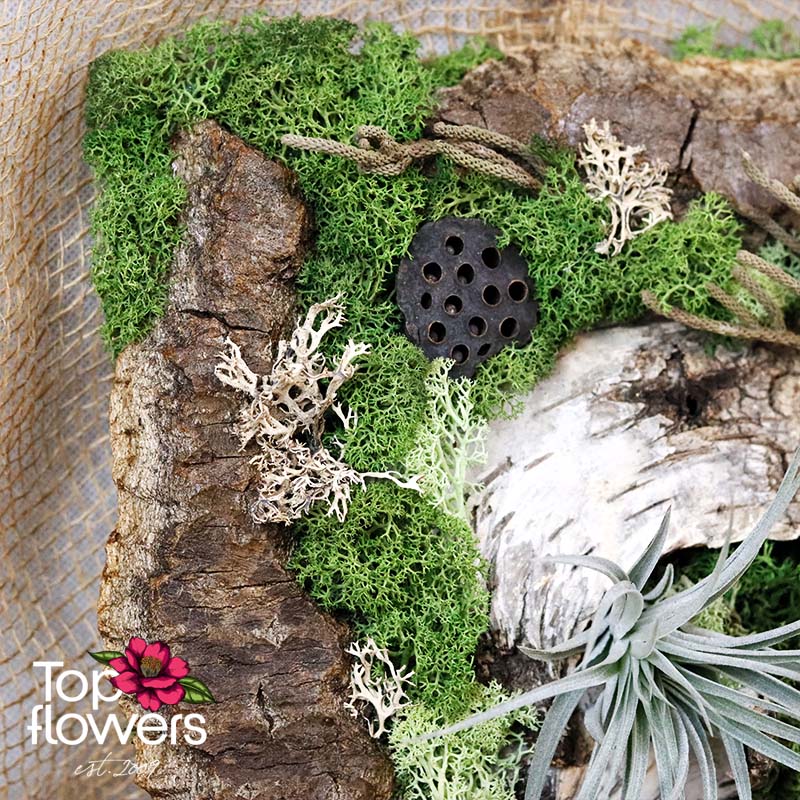 Потопете се в магията на зимните празници с тази уникална коледна аранжировка! Поставена в дървено панерче, композицията включва естествени иглолистни клонки, сиво - бяла декорация украсена с ръчно подбрани орнаменти. Акцент в дизайна е симпатично коледно джудже и свещта, които внасят уют и топлина в празничната обстановка. Подходящо за декориране на дома, офиса или като оригинален подарък за близки.