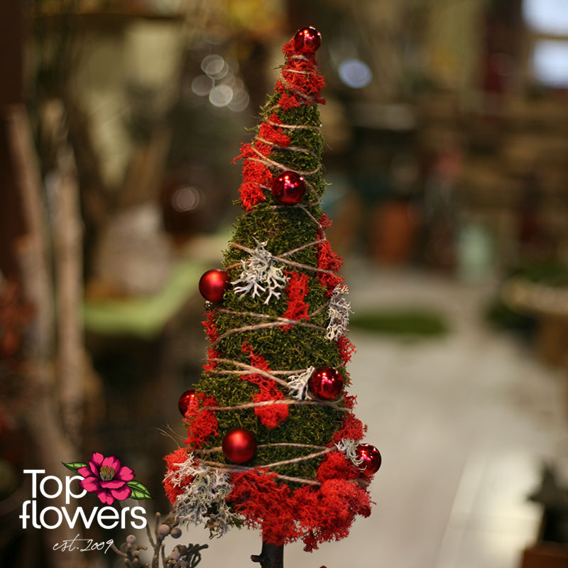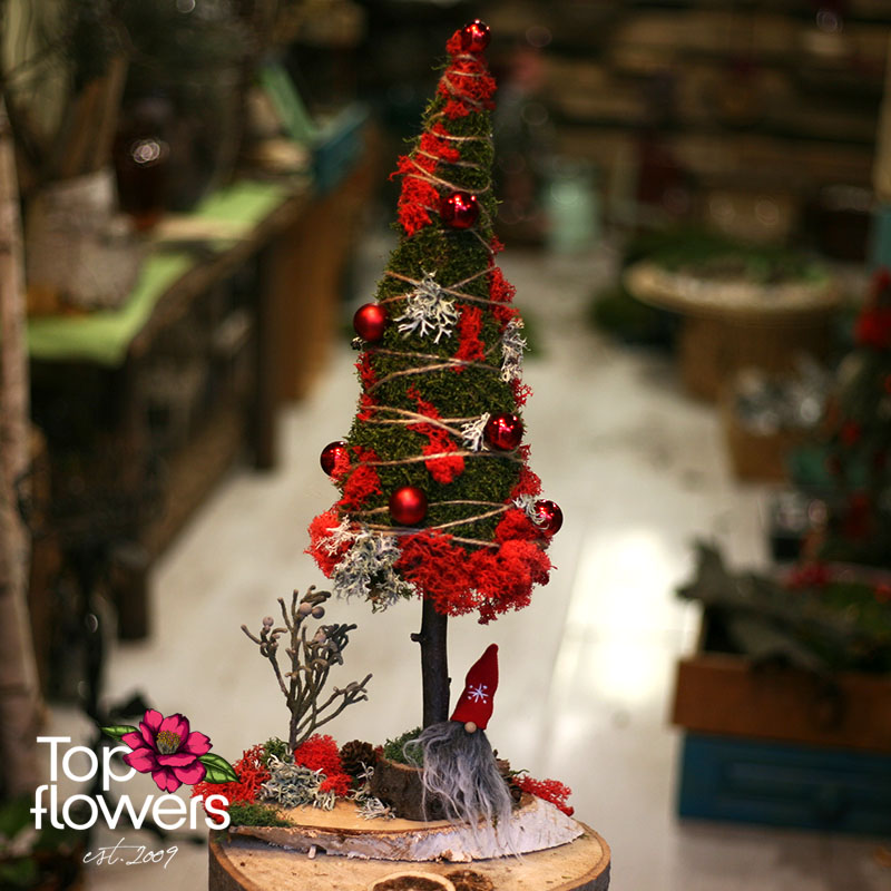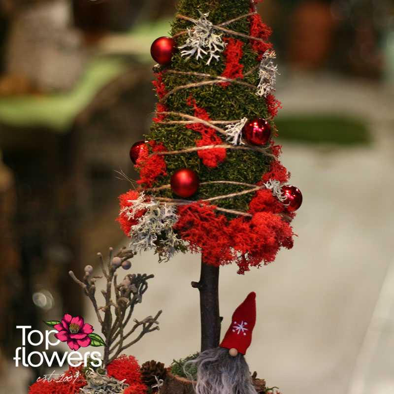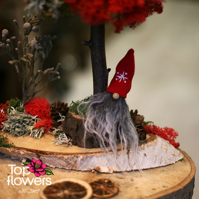"Скритото джудже" е ръчно изработена декоративна композиция, която пренася празничния дух във вашия дом. Изящното дръвче е оформено с борови клонки, червени декорации в цветовете на духа на Коледа и естествен скандинавски мъх. Върхът е украсен със скрито джудже, придаващо завършен забавен коледен облик. Основата е поставена в съд, обвит с декоративни елементи.