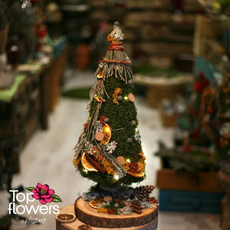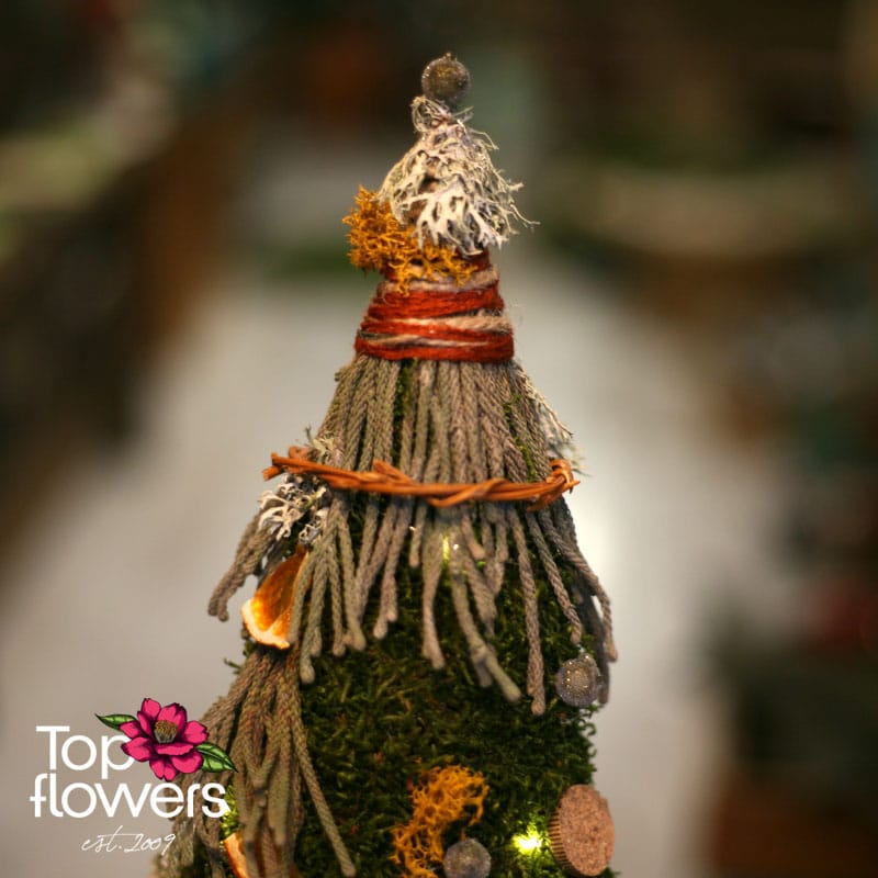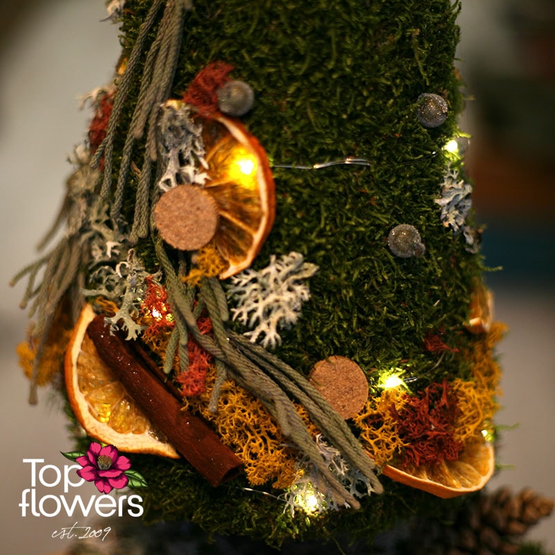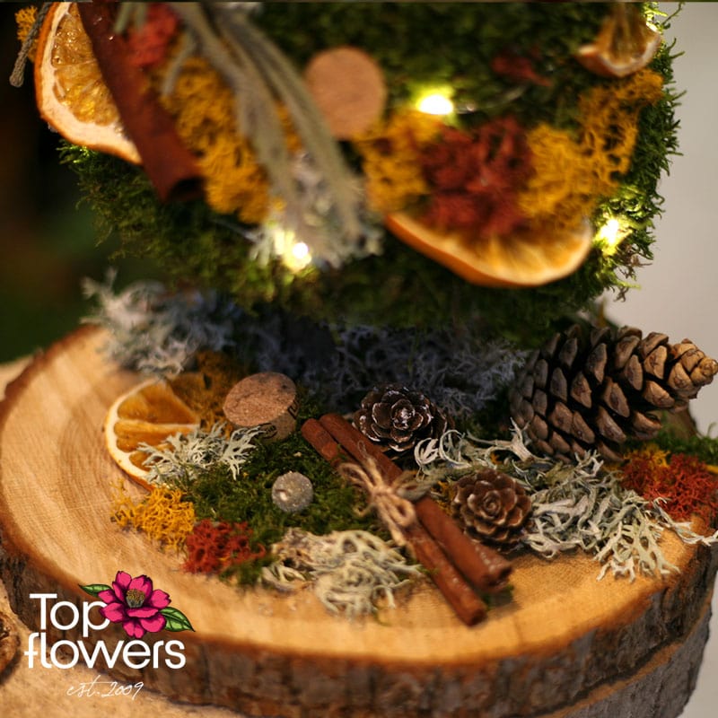 „Пъстри Мъхове“ е малка арт инсталация, която носи голяма зимна магия. Създадена е ръчно от естествени сухи материали и висококачествен горски мъх - онзи тип детайл, който напомня защо ние в нашия магазин за цветя вярваме, че природата разказва по-красиви истории от всяка декорация. Тук ще откриете комбинации от скандинавски мъх, ароматни пръчици канела, шишарки, резени портокал и финo LED осветление, което оживява композицията като малък светещ спомен от гората.
