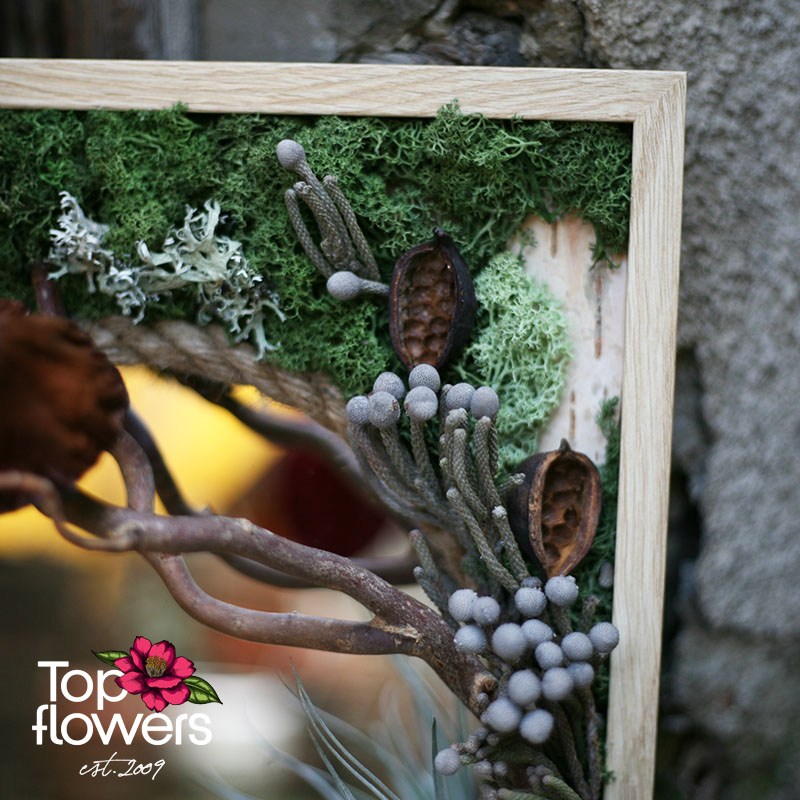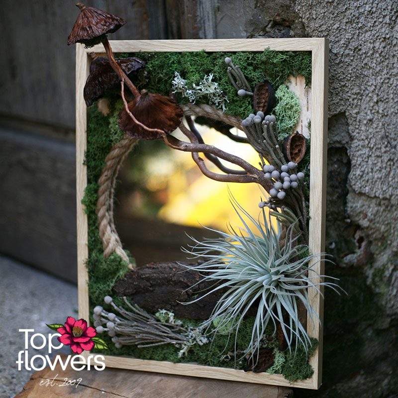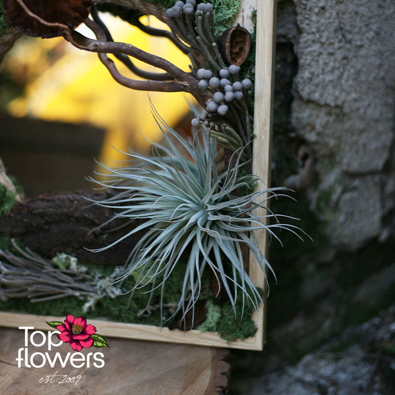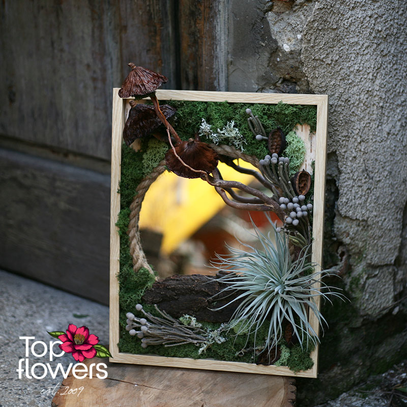 Понякога най-красивите неща са тези, които ни карат да се спрем… и да се вгледаме. „Горско отражение“ е повече от жива картина – това е малък свят, в който природата среща въображението. Скандинавският мъх, естествените елементи и деликатната тиландсия създават усещане за истинска горска сцена, а вграденото огледало добавя дълбочина и живот – сякаш природата се отразява във вас.