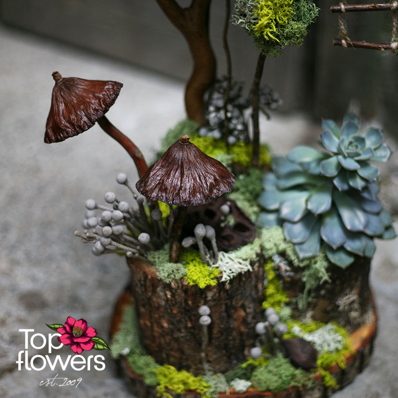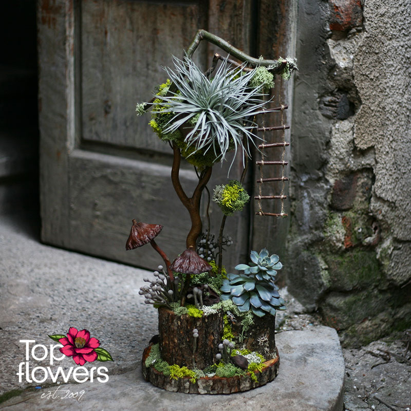 Арт инсталация „Скритата гора“ е малък свят, събран в една композиция - загадъчен, артистичен и различен. В нея въздушното растение тиландсия, сукулентът, скандинавският мъх, декоративните гъби и естествените дървесни елементи създават усещане за тиха гора, в която всяко детайлче има свое място. Това не са просто цветя – това е история, разказана чрез форма, текстура и вдъхновение.