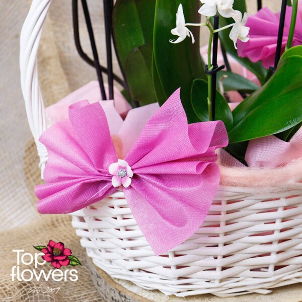 "Бяла елеганция с орхидеи" - Завладяваща визия на изчистена красота и стил. Този плетен бял панер е като празното платно, върху което са поставени три великолепни орхидеи фалаенопсис, всяка със своята уникална нежност и изтънченост.