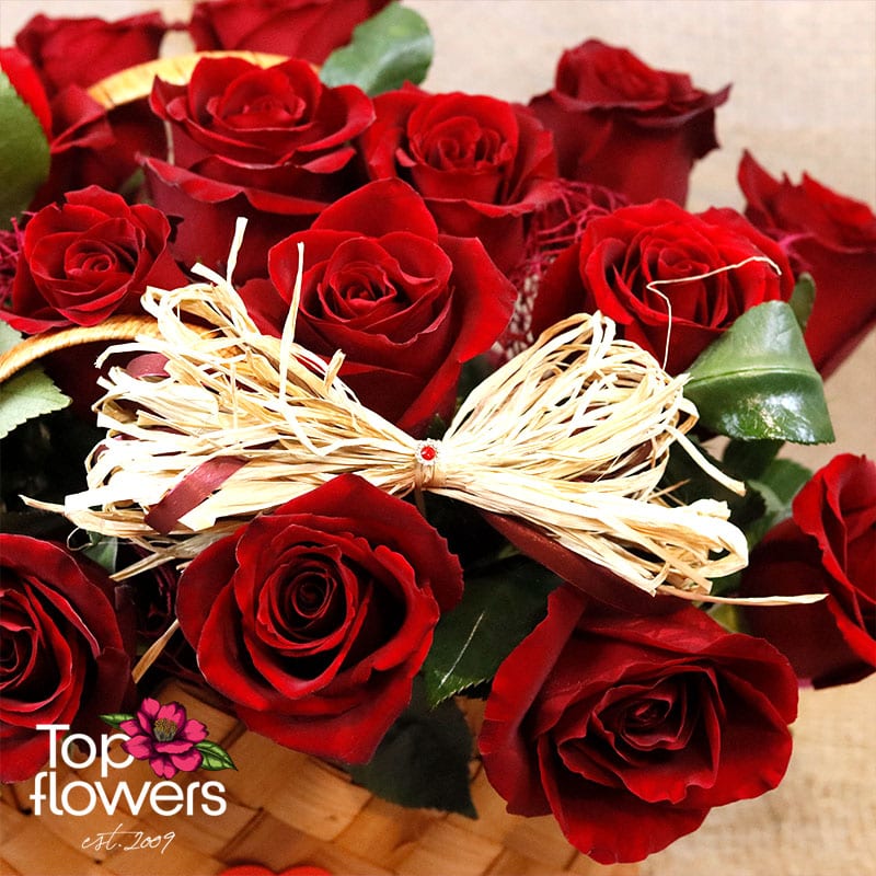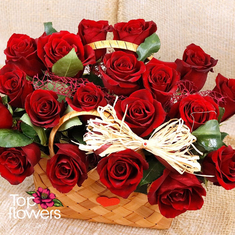 Тази елегантна декоративна плетена чанта е изпълнена с нежност и стил, представена чрез аранжировка от първокласни рози, които излъчват свежест и изисканост. Чантата е подходяща за всеки специален повод, добавяйки уникален акцент към момента. Имате уникалната възможност да персонализират подаръка, избирайки цвят на розите според предпочитанията си – цикламени, бели, розови, червени, прасковени или огнени. Тази композиция е перфектен начин да изразите своите чувства и внимание към близък човек.