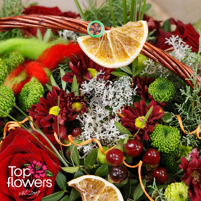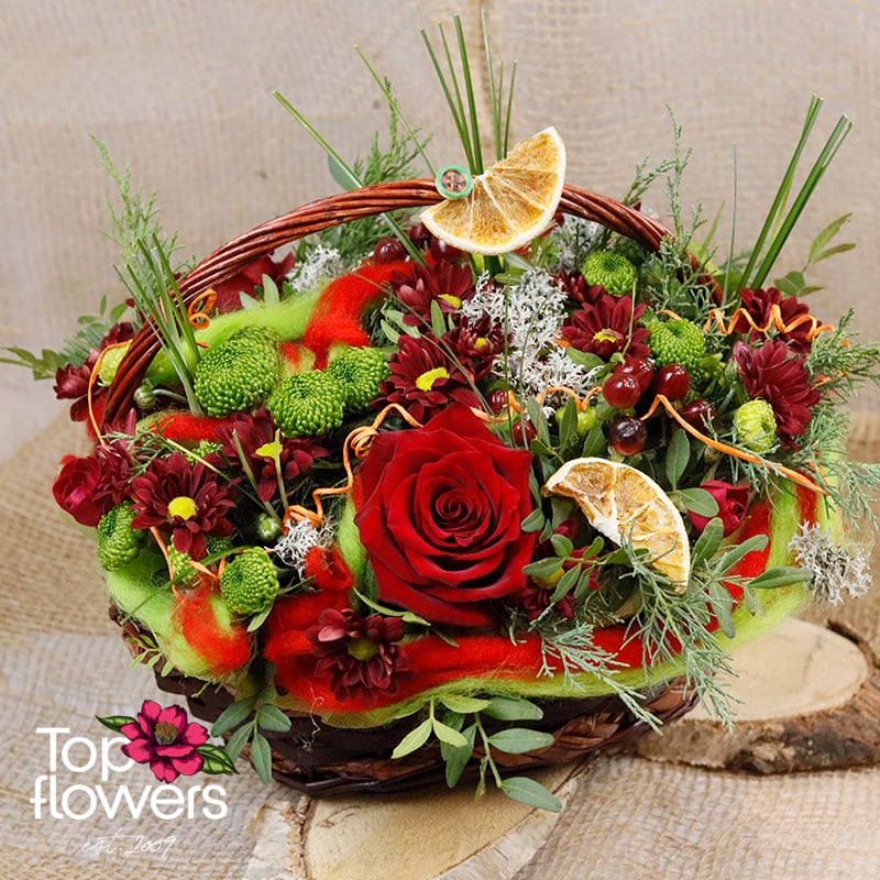 Червената шапчица е кошница с цветя, вдъхновена от топлите, наситени цветове на природата и усещането за уютен жест, поднесен от сърце. Това е аранжировка с характер – наситено червено, свежо зелено и деликатни декоративни акценти се преплитат в композиция, която носи настроение, емоция и леко приказно усещане. Розите придават класическа елегантност и силно послание, хризантемите добавят плътност и дълготрайност, а хиперикумът внася фин декоративен контраст и свежест.