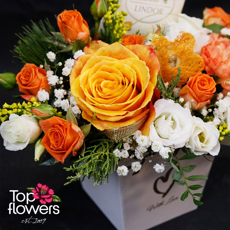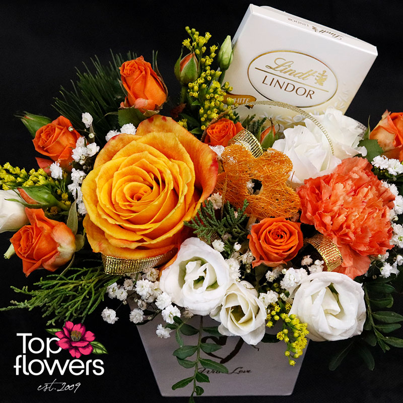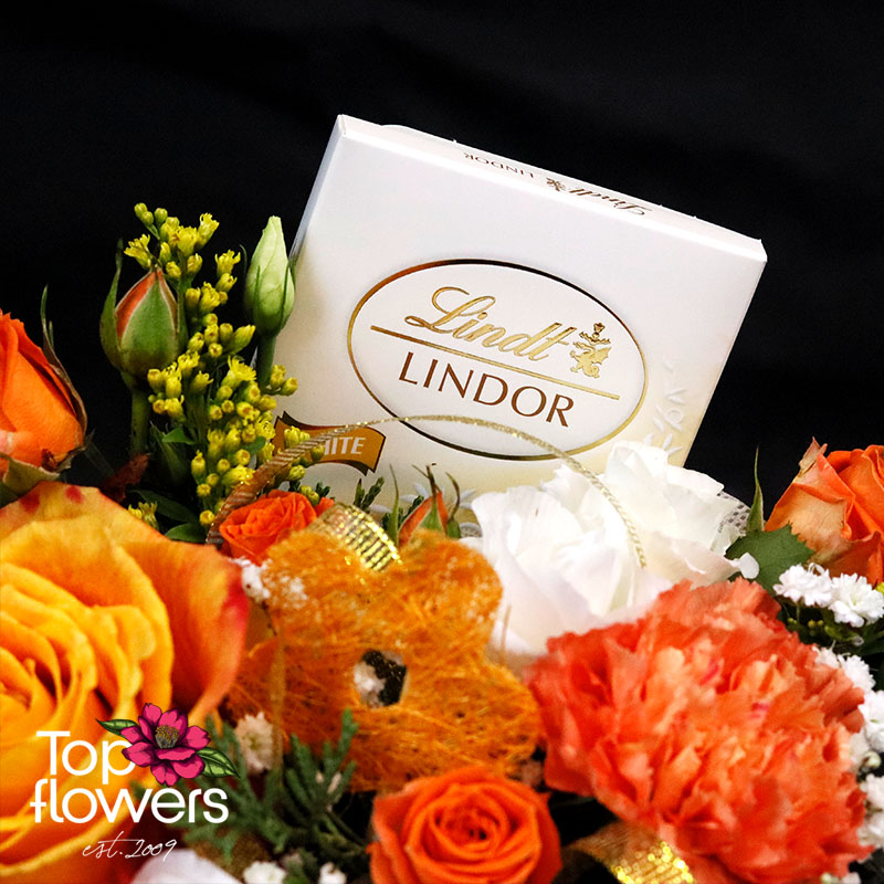 Цветовата палитра – слънчево оранжево, кремаво бяло и свежо зелено – създава усещане за радост, топлина и позитивна емоция. Аранжировката е подходящ избор за рожден ден, имен ден, благодарност или просто когато искате да зарадвате с нещо различно и модерно. Бял шоколад Lindor добавя фин завършек и превръща композицията в пълноценен подарък, готов за поднасяне.