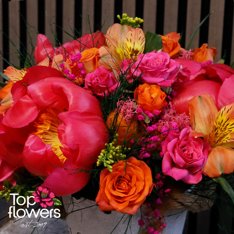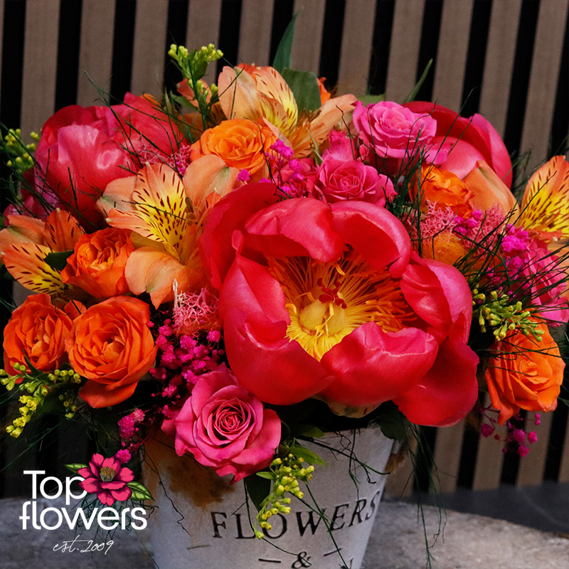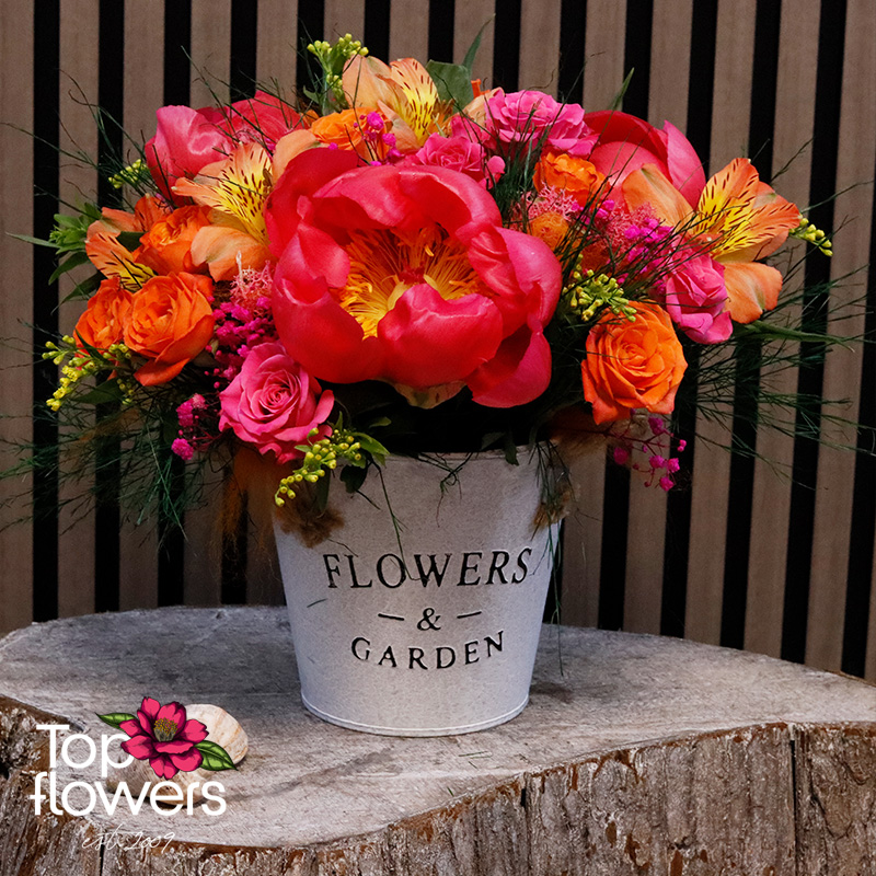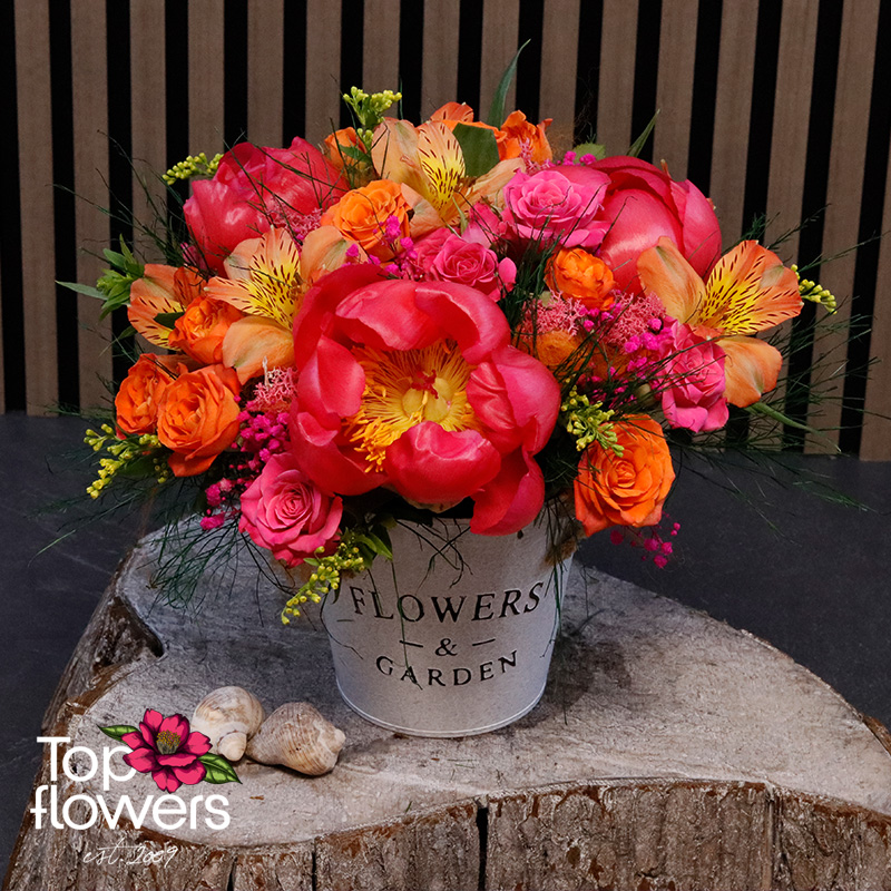 Екзотичен коктейл е впечатляваща аранжировка, създадена за хора, които обичат цветовете, настроението и нестандартната красота. Съчетава божур, мини роза и алстромерия в огнен микс от розови, оранжеви и слънчеви нюанси, които веднага привличат погледа и носят усещане за празник. Подредена в стилна декоративна метална кашпа, тази композиция е чудесен избор за рожден ден, благодарност, юбилей или просто като красив жест без повод.
