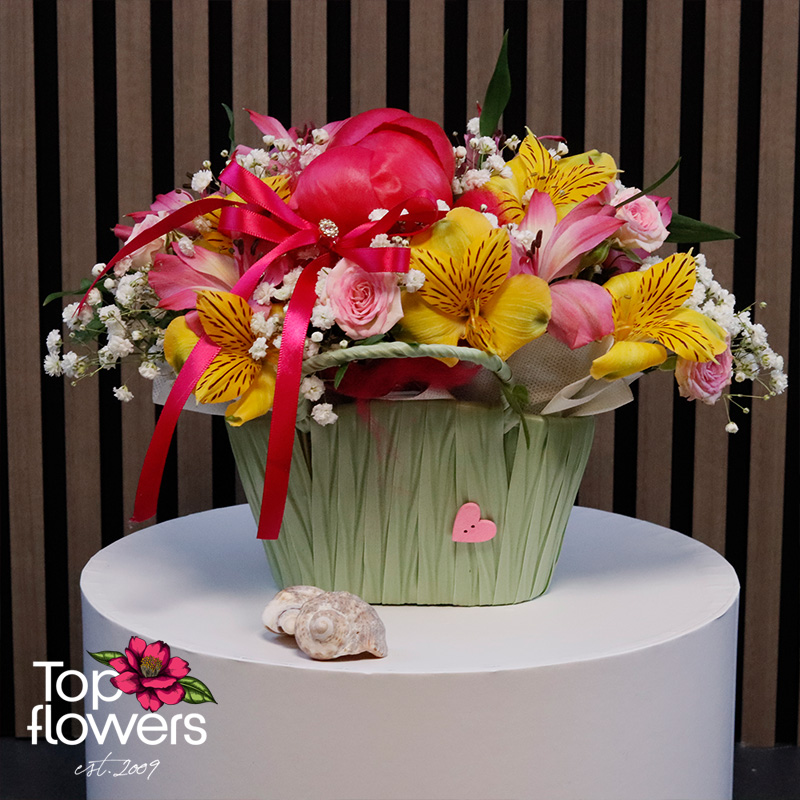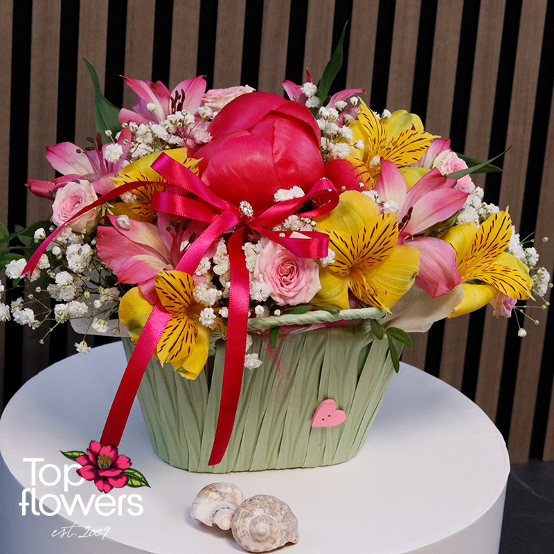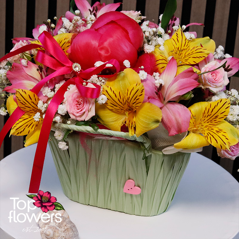 Градинка е очарователна аранжировка, която носи настроение, нежност и усещане за цветен празник. Създадена е като малка приказна композиция, в която божур, мини рози и алстромерия се съчетават хармонично в красив декоративен панер. Това е подарък, който впечатлява с финес и носи усмивка още с първия поглед.