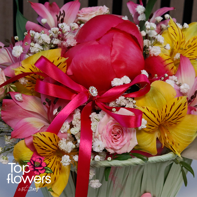 Божурът е символ на щастие, благополучие и красиви нови начала. Мини розите добавят романтика, внимание и деликатна елегантност, а алстромерията носи послание за приятелство, топлина и искреност. Ярките цветове и нежните нюанси превръщат тази аранжировка в истинско цветно бижу, подходящо за всеки специален повод.
