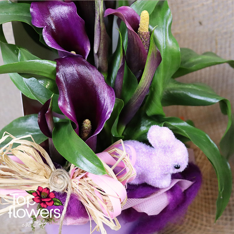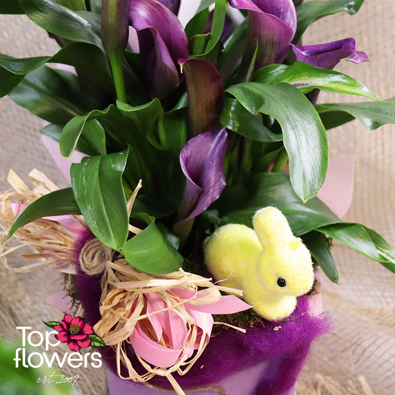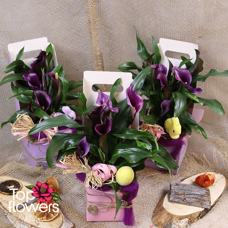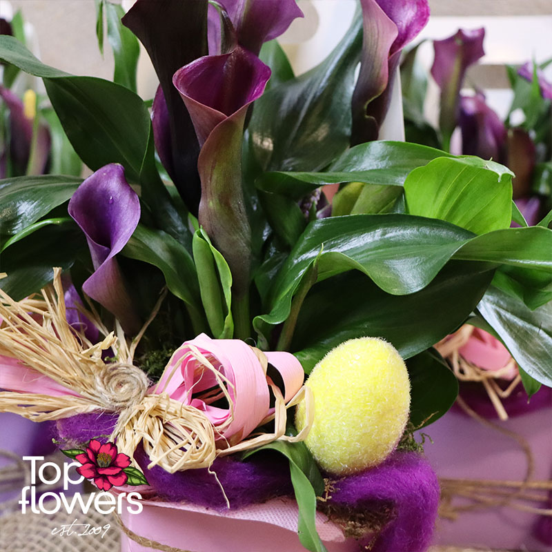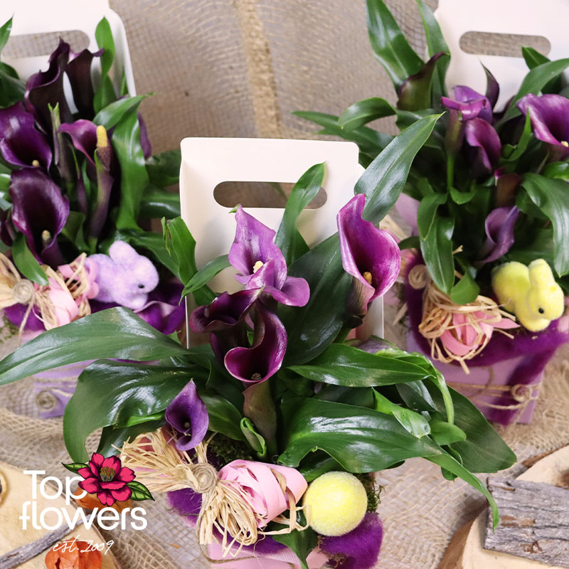Кала в кутия с декорация е нежен и стилен подарък, който носи усещане за празник, свежест и внимание към детайла. Живото растение кала (Zantedeschia) впечатлява с изящната си форма и наситения си цвят, а сезонните зеленини, декоративното велурено покритие, естествените рафия и сухи елементи допълват визията с топлина и великденско настроение. Подаръчната кутия с дръжка прави аранжировката още по-ефектна и удобна за поднасяне.