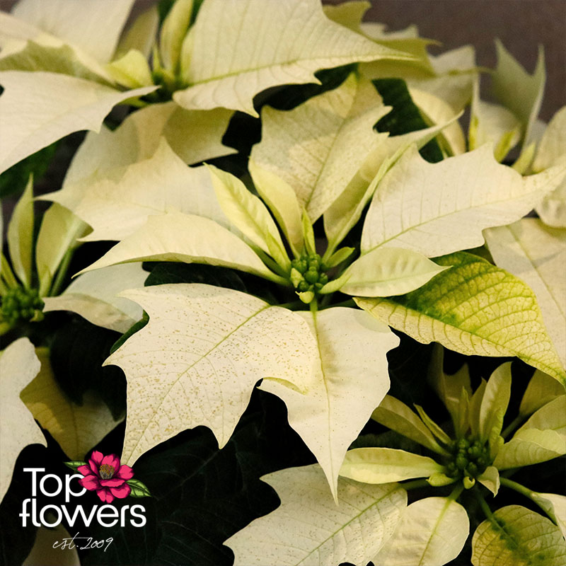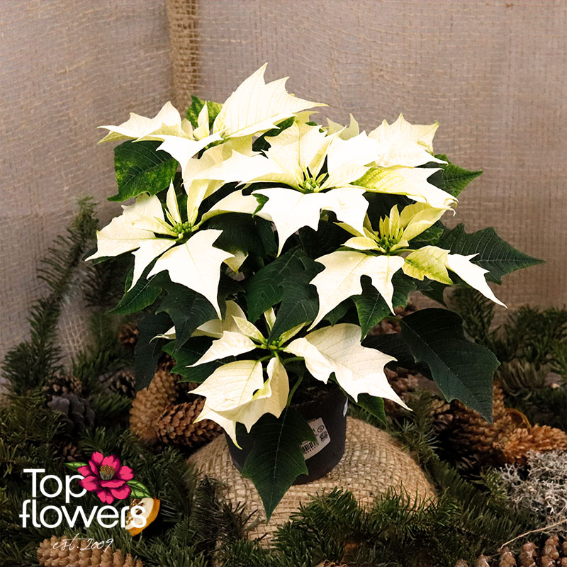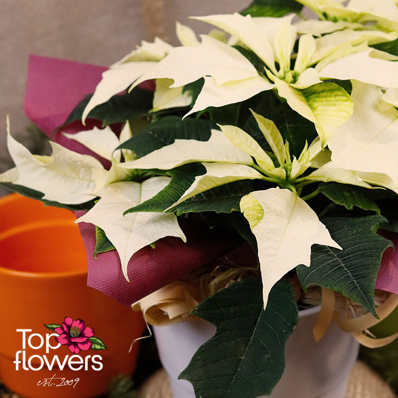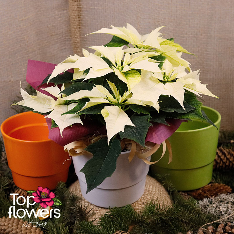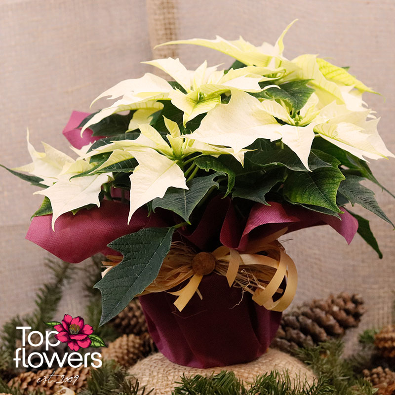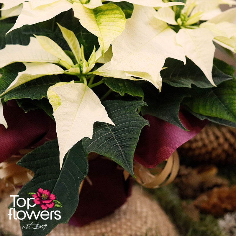 Бялата Коледна звезда е съвременната интерпретация на празничната класика. Нейните кремаво-бели прицветници внасят светлина, чистота и онзи спокоен зимен уют, характерен за минималистичните и скандинавски интериори. В нашия магазин за цветя я подбираме внимателно, защото знаем, че този по-нежен сорт трябва да бъде перфектен като форма, цвят и свежест.