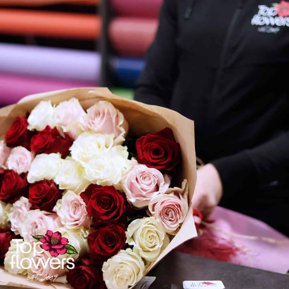 - 31 бр. първокласни червени, бели и розови рози