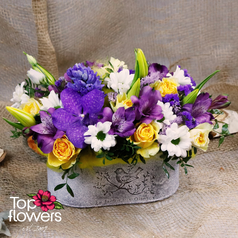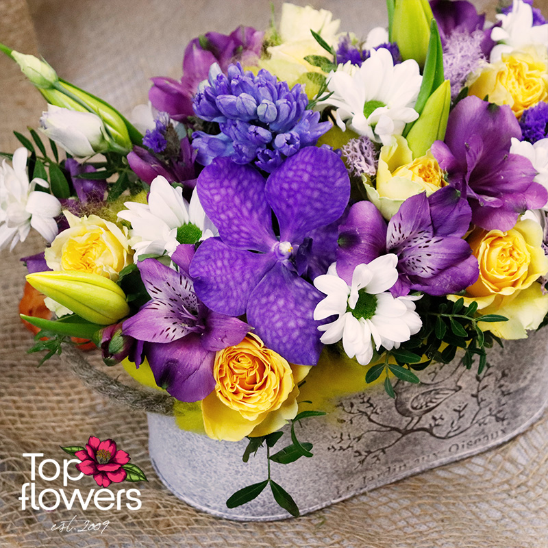 Лилавите нюанси на Ванда и алстромерията се преливат със слънчевите тонове на мини розите, а зюмбюлът и лалетата внасят усещане за пролет и ново начало. Това са цветя, които говорят тихо, но остават дълго в съзнанието. Подредени в стилна метална основа, те създават завършен подарък - без нужда от допълнителна ваза или аранжиране.