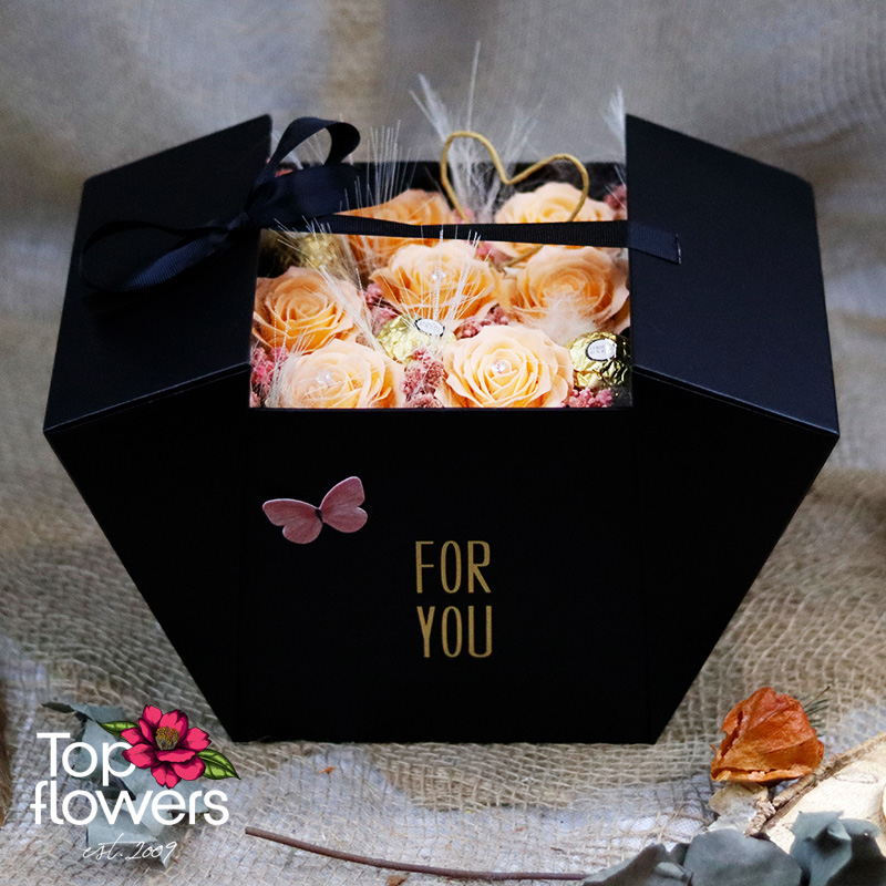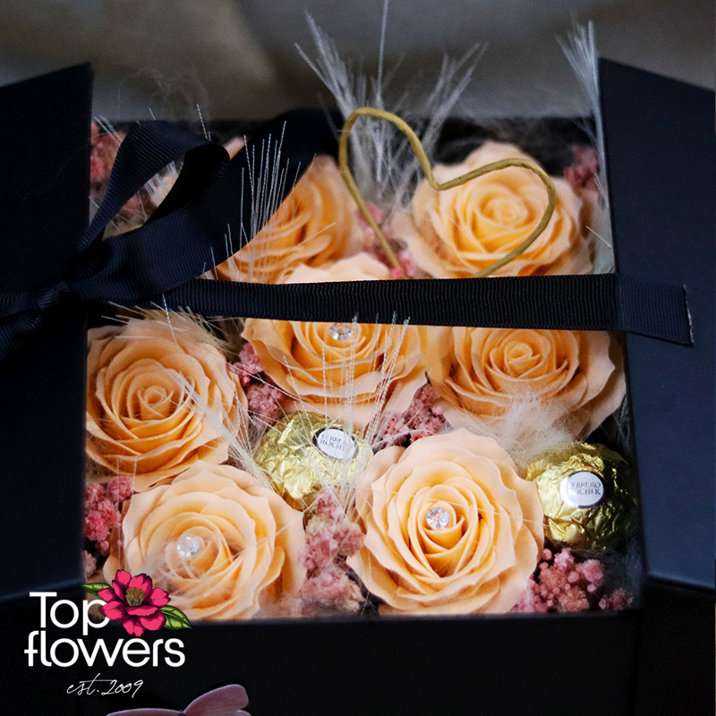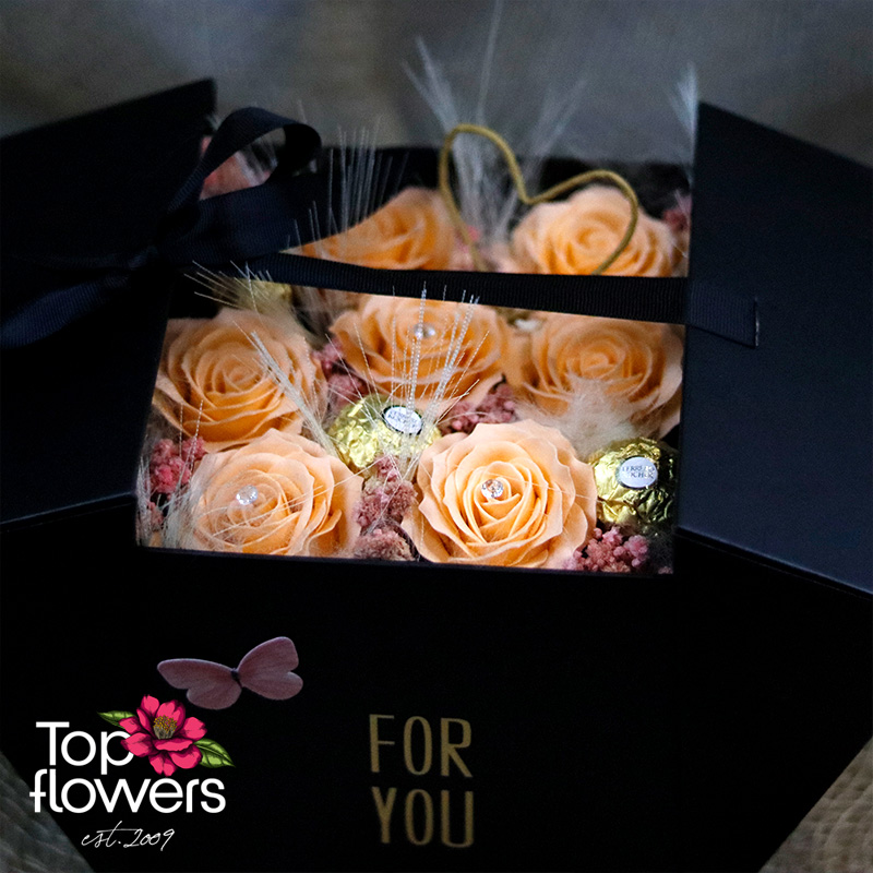 Тук цветята не са просто акцент – те са центърът на вниманието. В комбинация с Ferrero Rocher композицията придобива още по-силен ефект – баланс между красота и сладко изкушение. Това е подарък, който говори без думи – за внимание, за отношение и за специално отношение към човека отсреща.