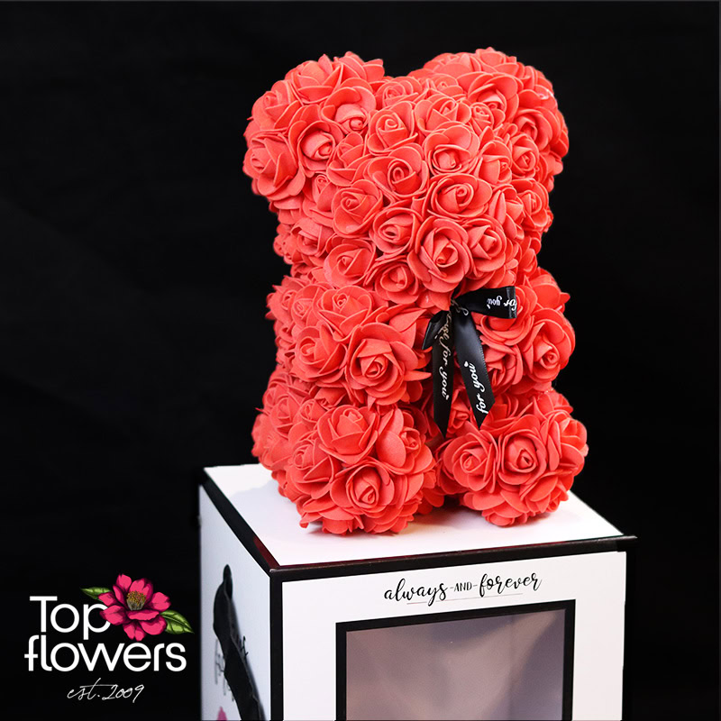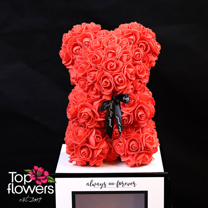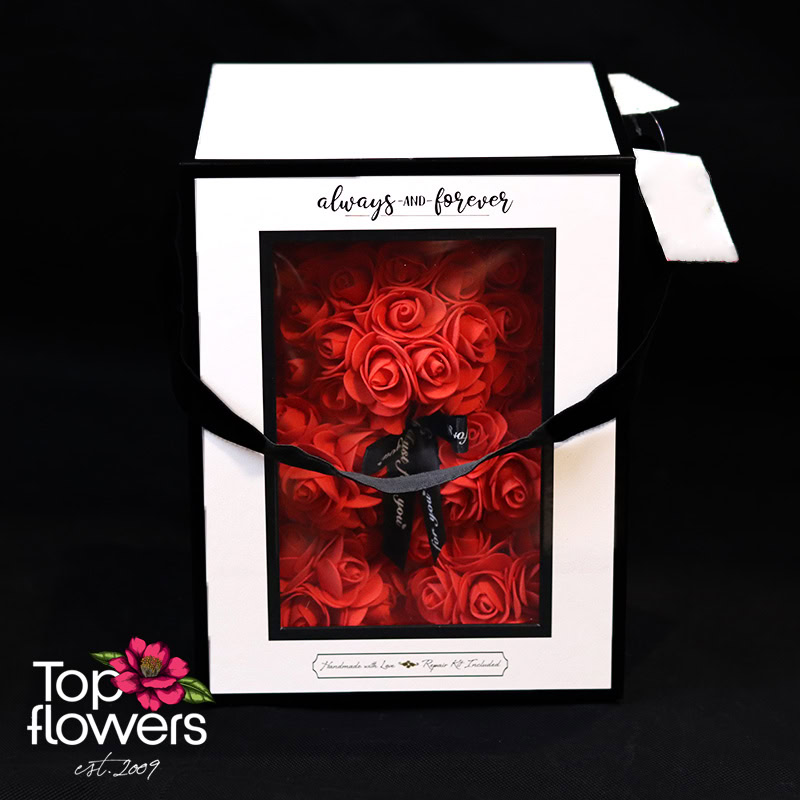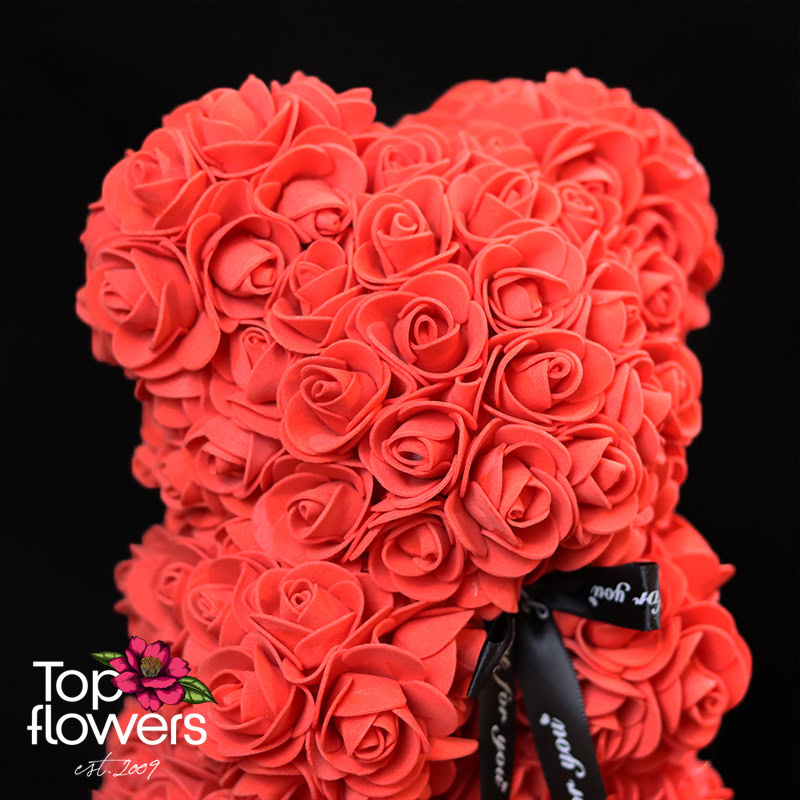 Наситеният червен цвят носи класика и романтика, а формата на мечето добавя мекота и топлина към посланието. Това не са просто цветя, а различен начин да ги поднесете – стилно, модерно и дълготрайно. Подходящ избор за Свети Валентин, годишнина, романтична изненада или когато искате да кажете „обичам те“ без думи.