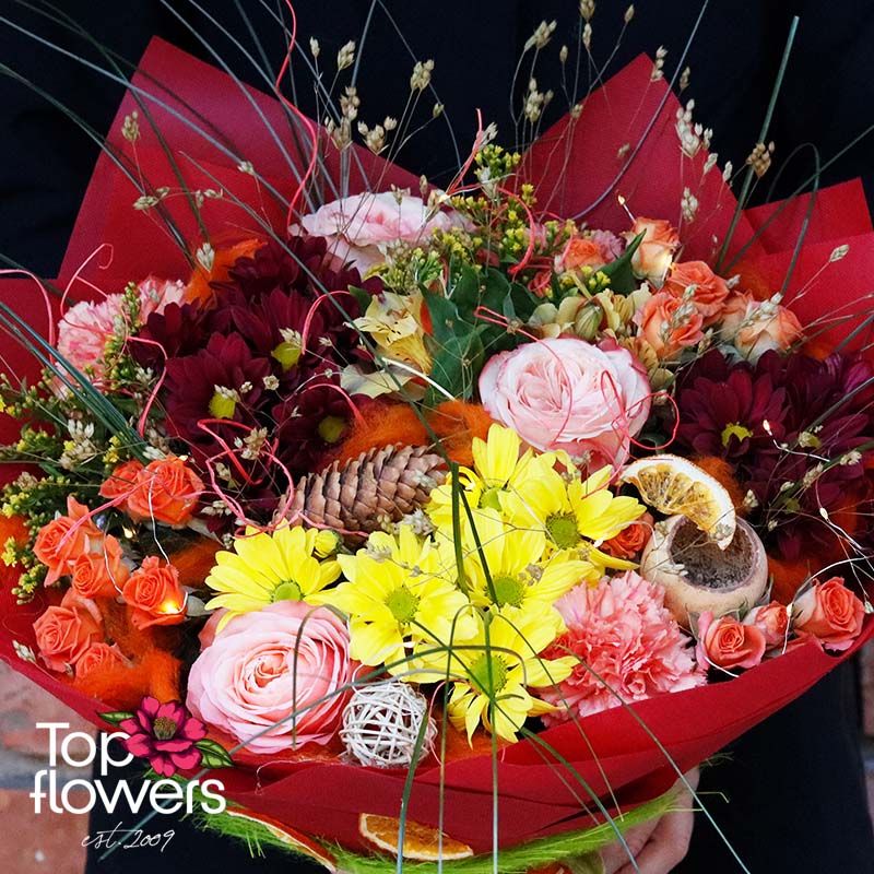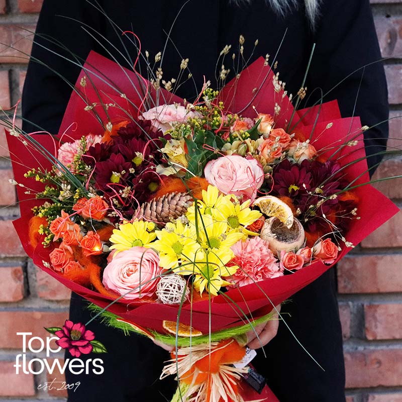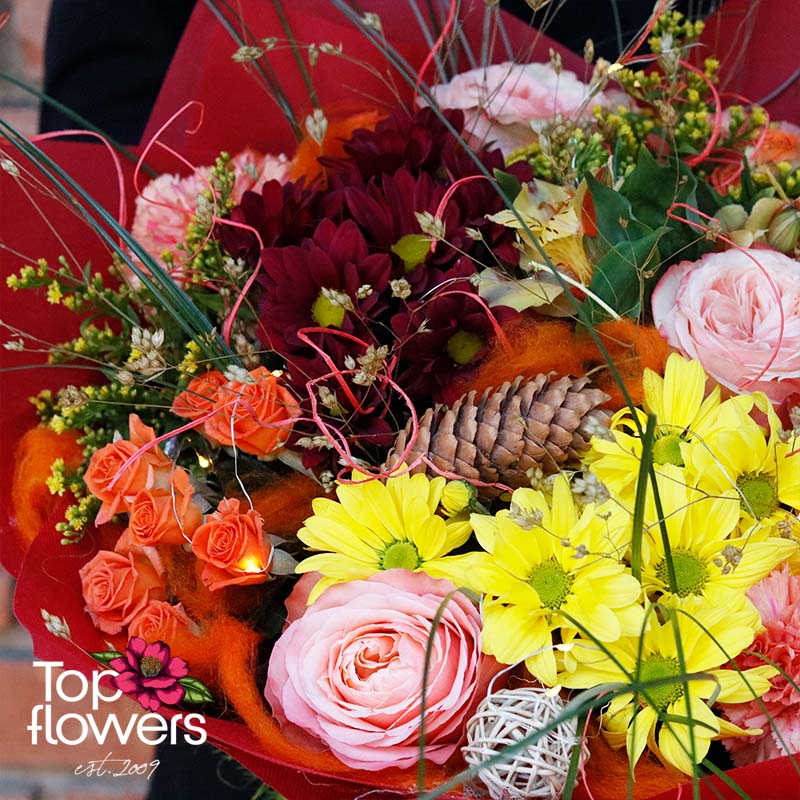 „Меден дъх“ – букет, който стопля сетивата и носи уют като късен следобед, огрян от златното слънце. Комбинацията от рози, мини рози, карамфили, хризантеми и алстромерия е внимателно подбрана, за да създаде усещане за хармония, топлина и изисканост. Всеки цвят е като нежна нотка в мелодия от емоции – розите символизират обич, карамфилите – признателност, а хризантемите носят дълголетие и светлина.