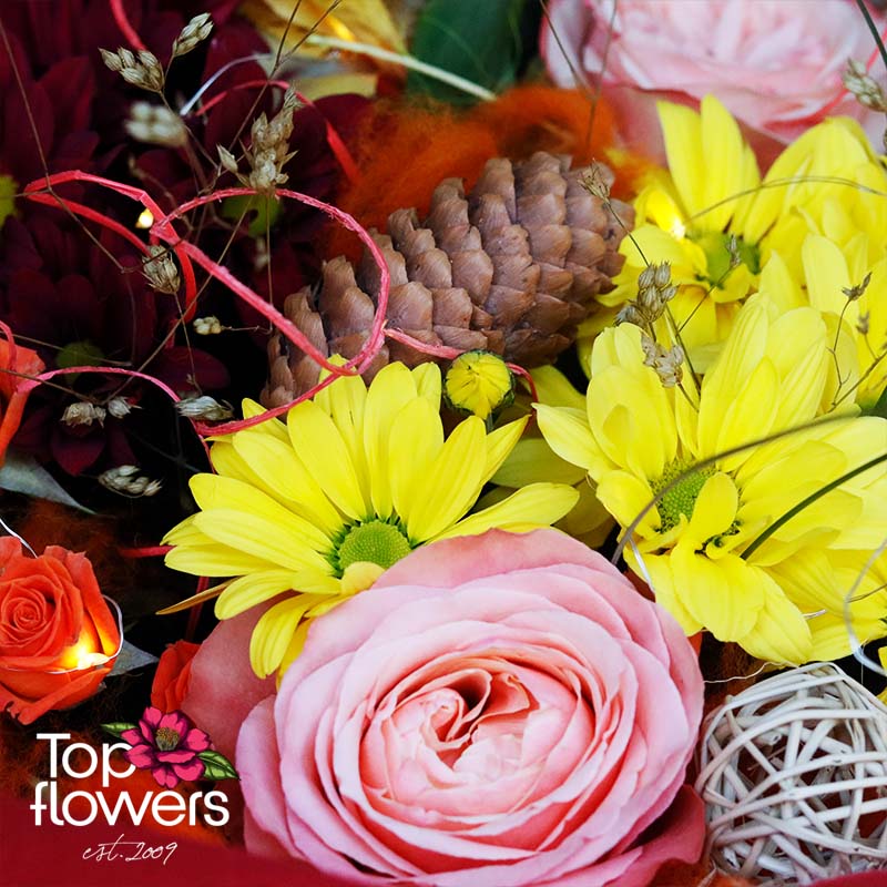 LED лампичките придават приказен блясък на композицията, превръщайки я в истинска малка магия. Декорациите и опаковката от естествени материали подчертават натуралната красота на цветята и допринасят за усещането за уют и стил. „Меден дъх“ е перфектен избор, когато искате да изразите топли чувства – било то за рожден ден, специален повод или просто, за да внесете усмивка в деня на някого.