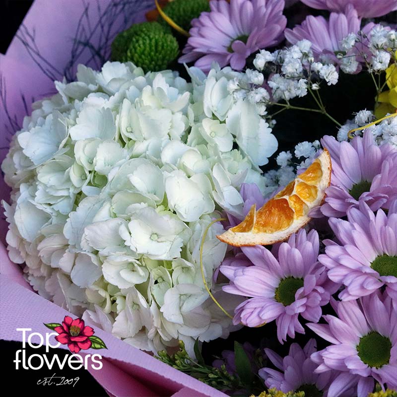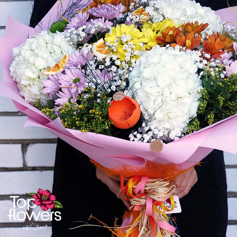 „Мелодия от цветове“ е букет, който звучи като поезия – хармония между изобилието на хризантеми и пищните форми на хортензиите. Сухите декорации и свежите зеленини добавят характер и текстура, превръщайки всеки детайл в нота от една съвършена симфония на природата.