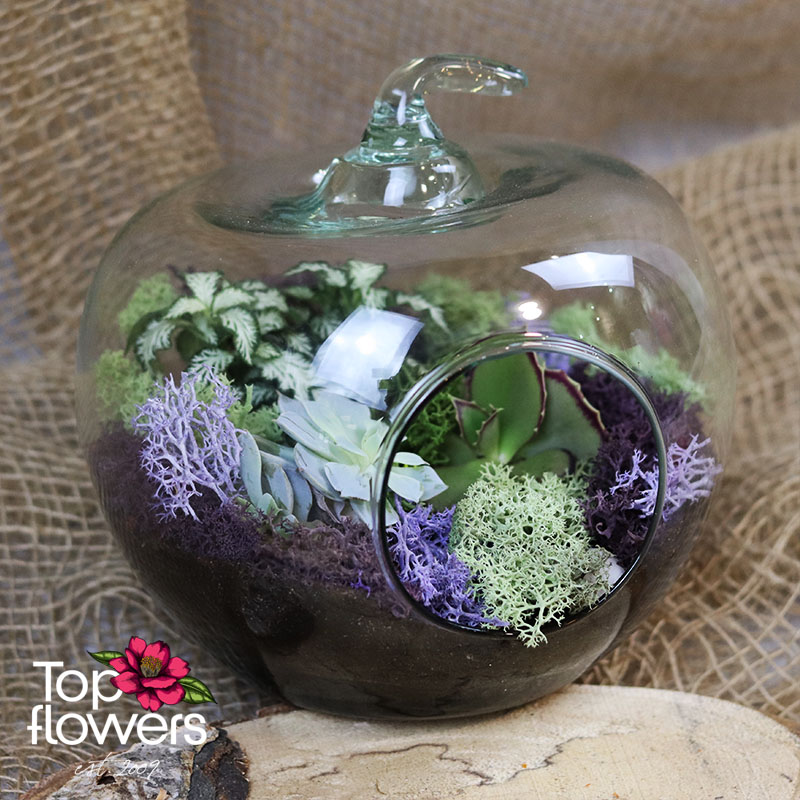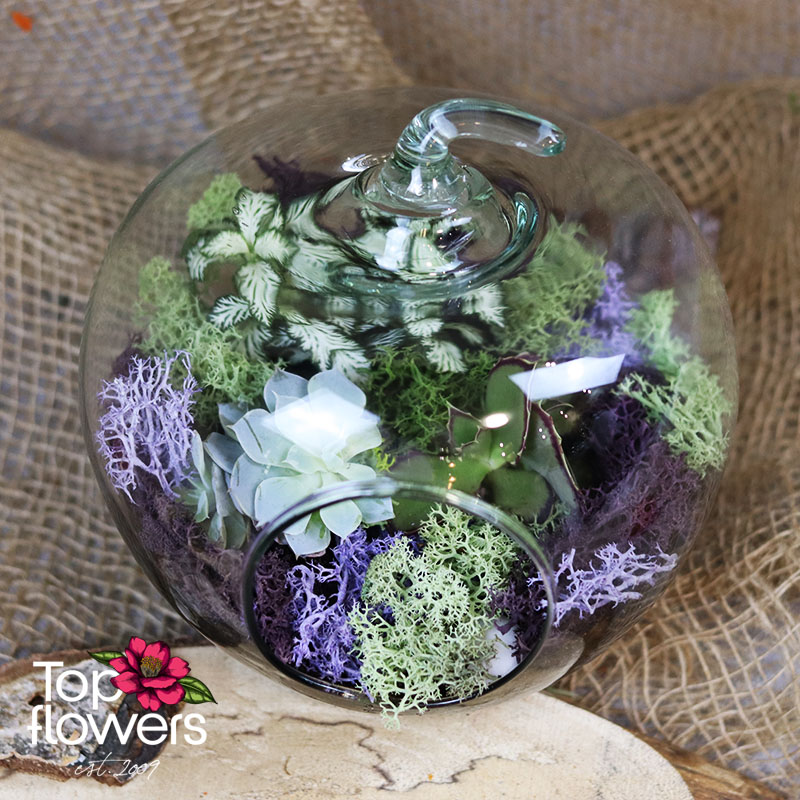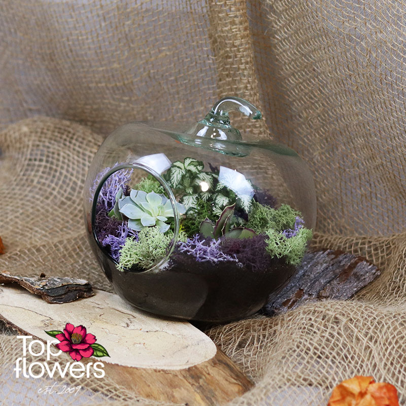 Понякога най-впечатляващите цветя не са в класически букет, а в малък свят, създаден с вкус и въображение. „Микс от цветя 3“ е стилна и модерна композиция в стъклен съд във формата на ябълка, която носи усещане за свежест, баланс и естествена красота. В нея сме съчетали сукуленти, скандинавски мъх в зелено и лилаво и подбран микс от листно-декоративни или цъфтящи растения, за да се получи ефектна аранжировка с артистично присъствие.