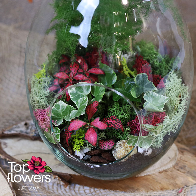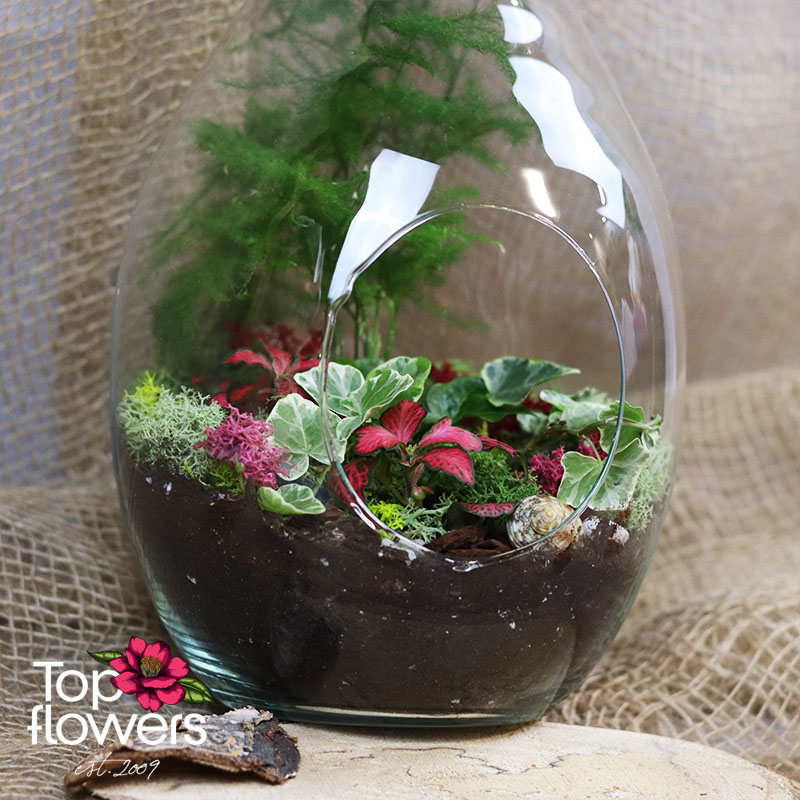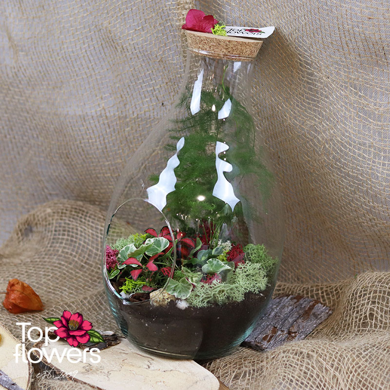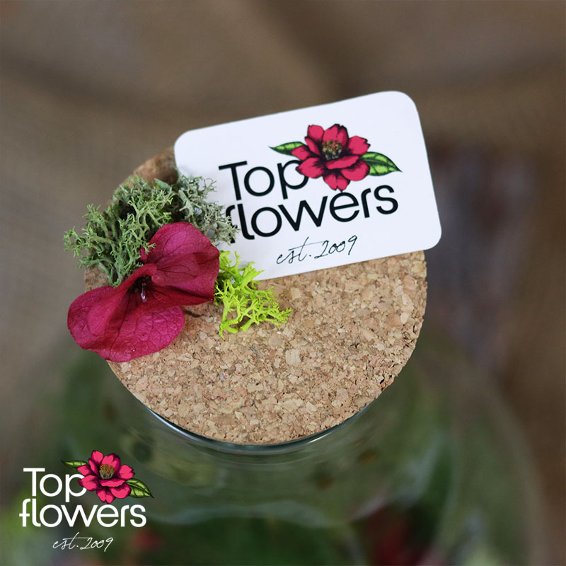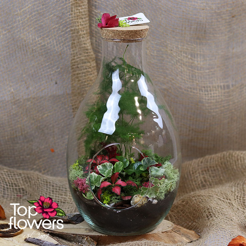 Аранжировката е подходящ избор, когато търсите различен подарък от магазин за цветя, който да носи характер и усещане за специално отношение. Стъкленият съд подчертава естествената красота на растенията и създава завършен декоративен свят, който се откроява със своята нежност и модерно излъчване. Всеки елемент е подбран така, че да допринася за баланса между зеленина, текстура и цвят.