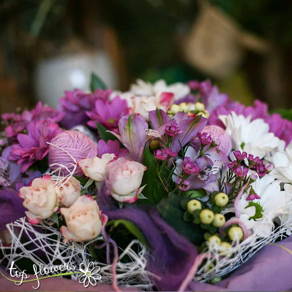 Пурпурен букет от мини рози, хризантеми и алстромерии! В розово-лилава гама от цветове, това предложение е подходящо за най-нежните сърца! Подарете розова фантазия и зарадвайте любим човек с букет от свежи цветя! С повод или без повод, за рожден ден, имен ден или когато искате да покажете любов, доставката ще е от нас, а посланието от Вас!