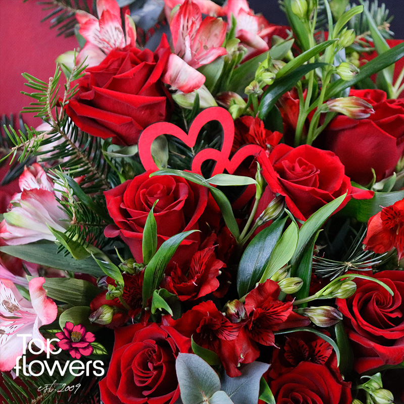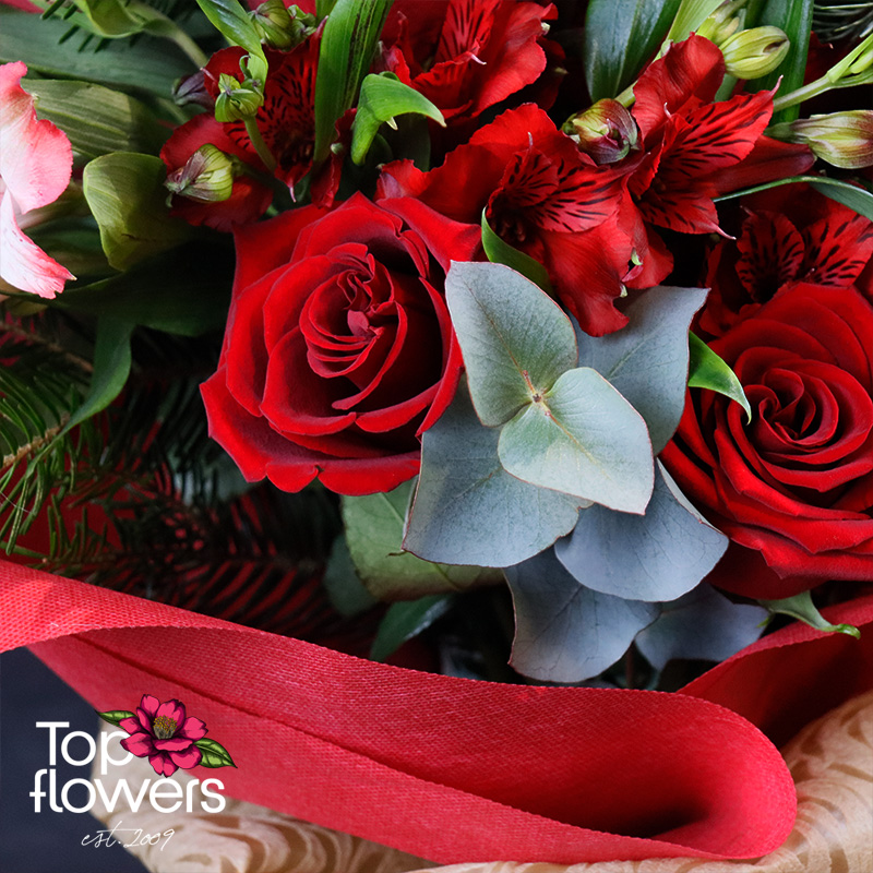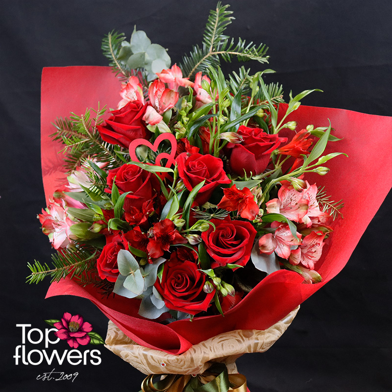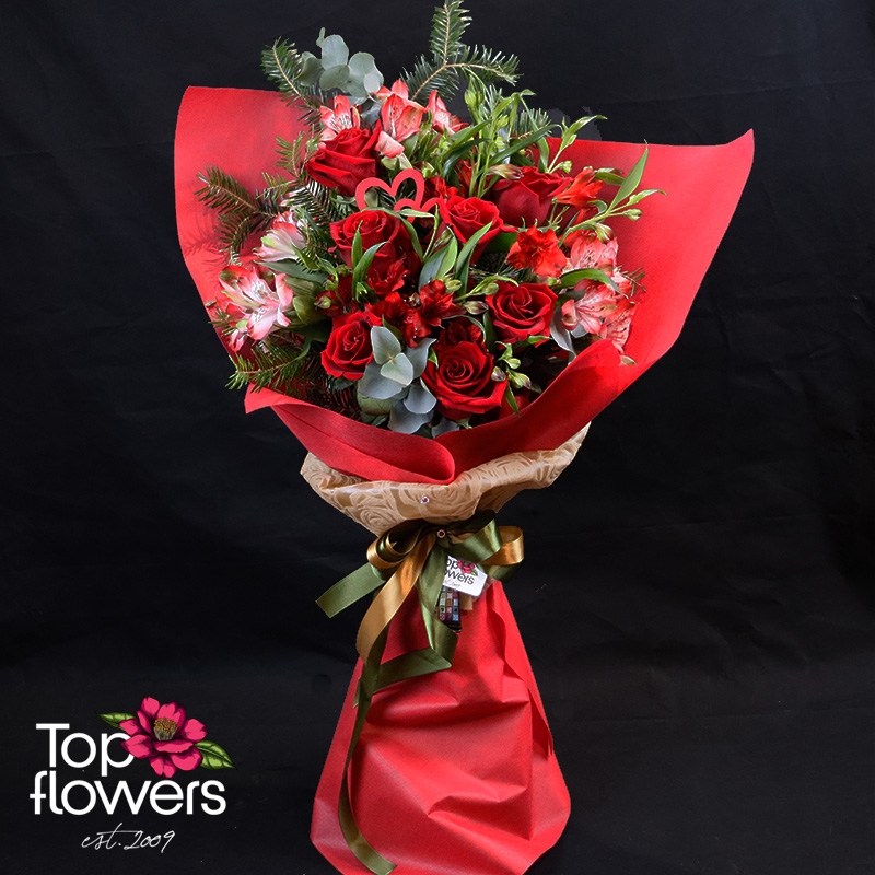 Романтика | Букет е класически жест, поднесен с модерна DELUXE елегантност. В основата му стоят еквадорските рози – наситено червени, кадифени и с онова дълбоко присъствие, което не се нуждае от обяснения. Те са допълнени от алстромерия, която внася лекота, движение и фин цветен контраст, а сезонните зеленина придава обем и естествен баланс на цялата композиция.