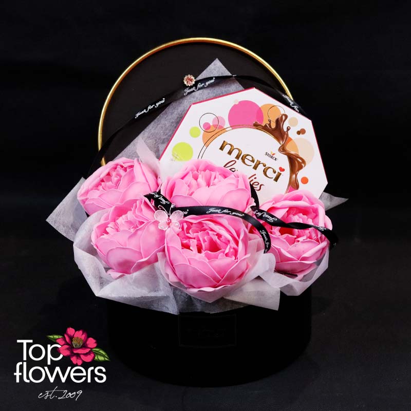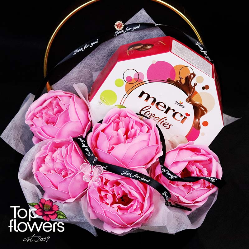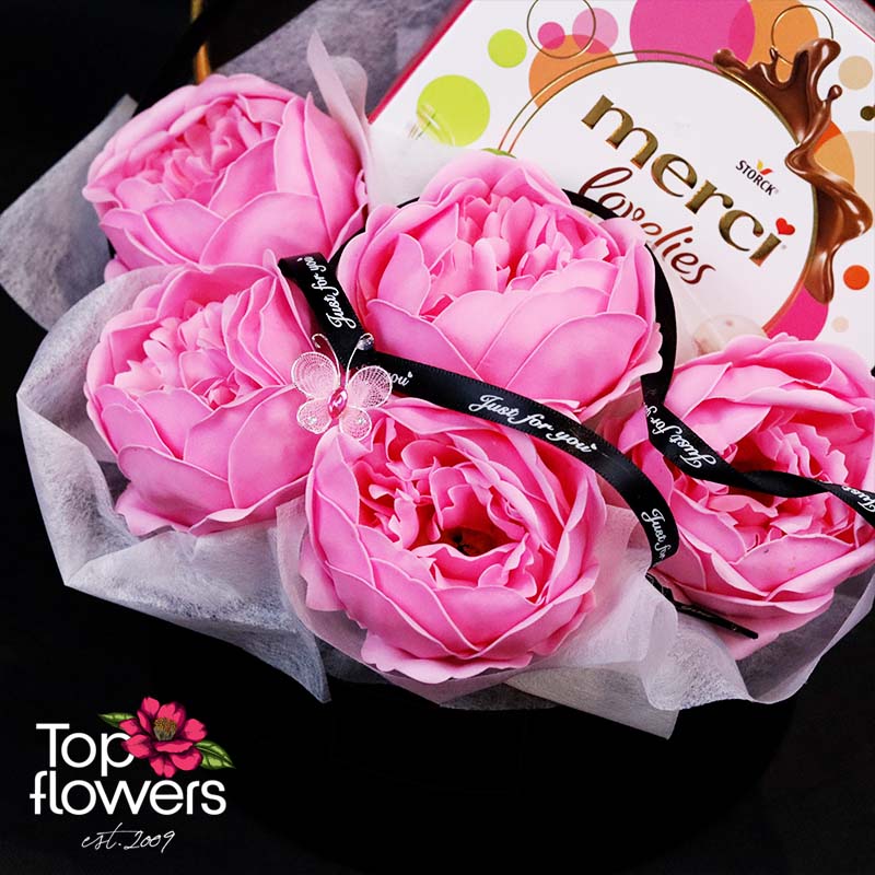 Нежните розови цветове символизират романтика, обич и деликатност, а сатенената панделка и фини акценти допълват изискания вид на композицията. За завършеност и сладост към подаръка е добавена кутия Merci Lovelies шоколадови бонбони 185 г, които създават истинско изкушение за сетивата.