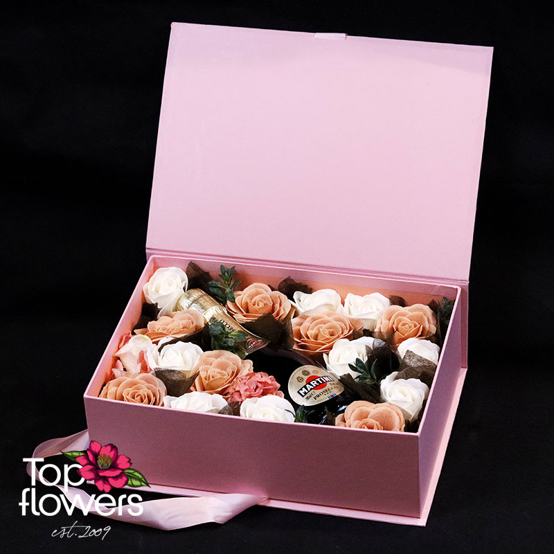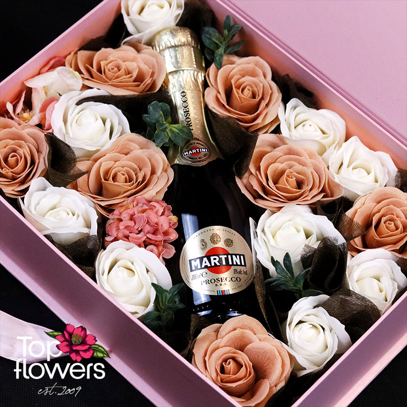 Нежните розови и кремави тонове създават усещане за топлина, романтика и финес. В центъра на аранжировката е бутилка просеко Martini, която придава празничен акцент и превръща композицията в завършен подарък за рожден ден, годишнина, Свети Валентин, моминско парти или специален жест без повод. Пълнежът от изкуствени дребноцветни и органзената хартия добавят обем и хармония, а цялостната визия е балансирана и изключително фотогенична.