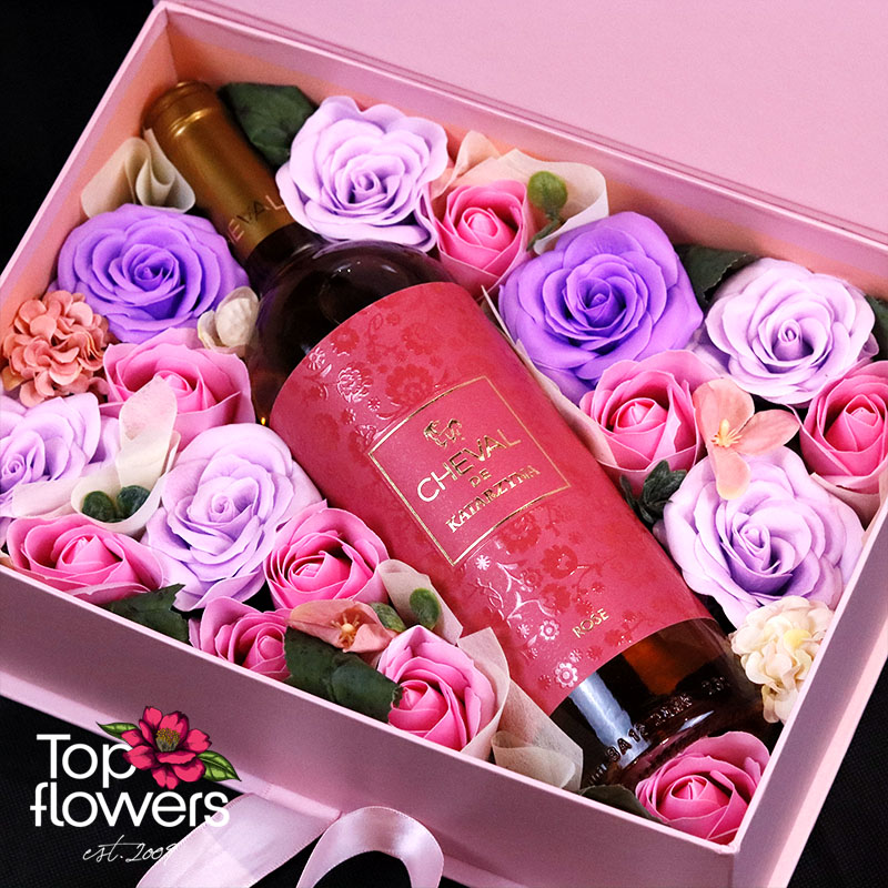 Комбинацията от розови, лилави и кремави нюанси създава усещане за романтика, женственост и финес. В центъра на композицията е бутилка Cheval De Katarzyna rosé – вино с характер и изискано присъствие, което добавя празничен акцент и завършва подаръка по елегантен начин. Пълнежът от изкуствени дребноцветни и органзената хартия придават обем и мекота, а цялостната визия е балансирана и изключително стилна.